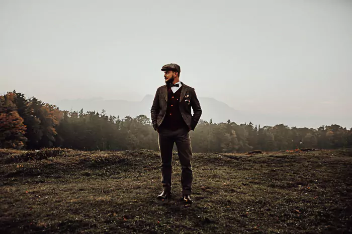 Der Bräutigam kokettiert mit dem Stil des frühen 20. Jahrhunderts: Hosenträger, Weste und Flatcap zeigen sich klassisch, während die Holzfliege einen von vielen persönlichen Akzenten setzt.