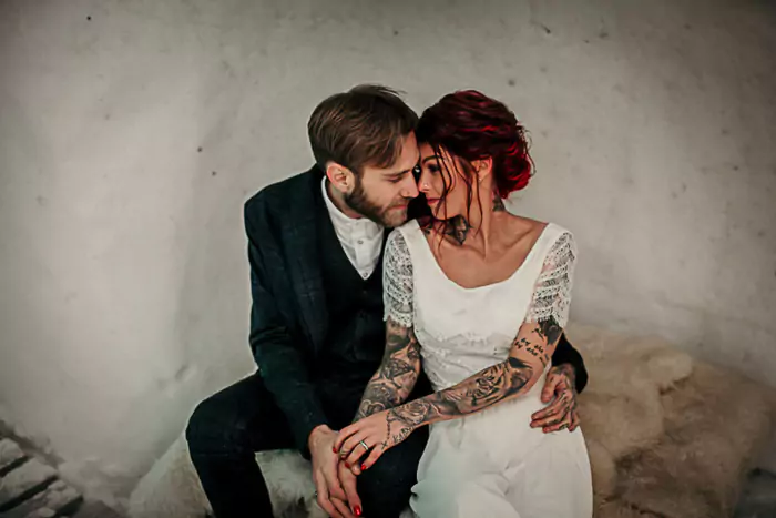 Das tätowierte Brautpaar war mindestens so wild wie das Wetter – denn sie hielten für grandiose Aufnahmen tapfer der Eiseskälte stand. Die mystische Stimmung harmonierte auch mit dem Farbkonzept dieses Elopements: Zurückhaltendes Grün, Creme und Weiß bei der Floristik, spannende schwarze Akzente bei der Hochzeitstorte und den Ringen. Den Höhepunkt fand dieses Gänsehaut-Abenteuer schließlich im romantischen Iglu.