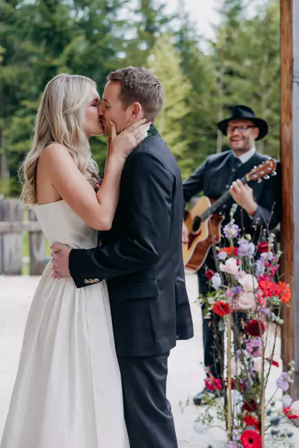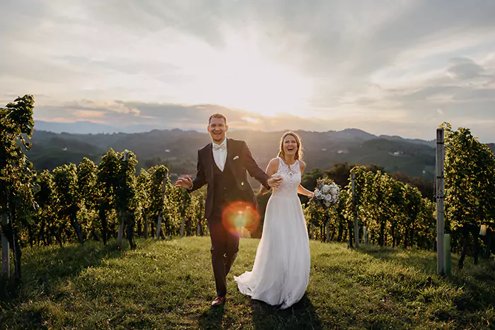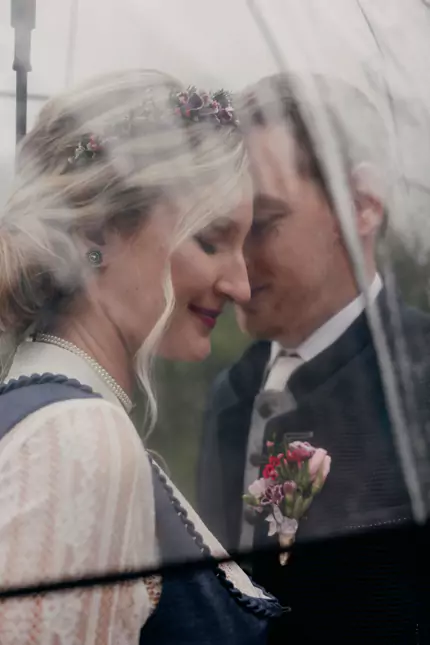 Und weil eine Trachtenhochzeit in der Steiermark einfach so viel hergibt, werfen sich Braut und Bräutigam abends nochmals neu in Schale: Die Braut tauscht ihre offene Haarpracht gegen eine moderne Brautfrisur mit Blütenkranz sowie das klassische Brautdirndl gegen ein knielanges Dirndl in Blautönen. Ihr Angetrauter zieht eine Lederhose sowie traditionelle Kniestrümpfen und Trachtenschuhe an.