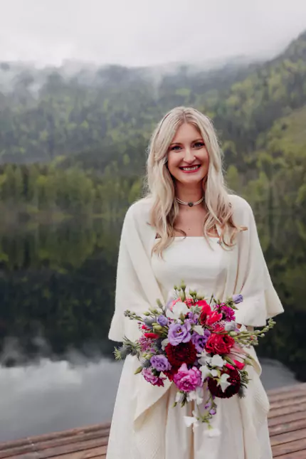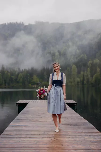 Mystisch schön zeigt sich an diesem Tag nicht nur die Landschaft, sondern auch die Braut: Ihr natürliches Make-up, die sanften Wellen im Haar, das Off-Shoulder-Hochzeitsdirndl mit zarter Schleife und wollenem Cape – all das passt perfekt zur authentischen Stimmung rund um den geheimnisvoll anmutenden Ödensee.