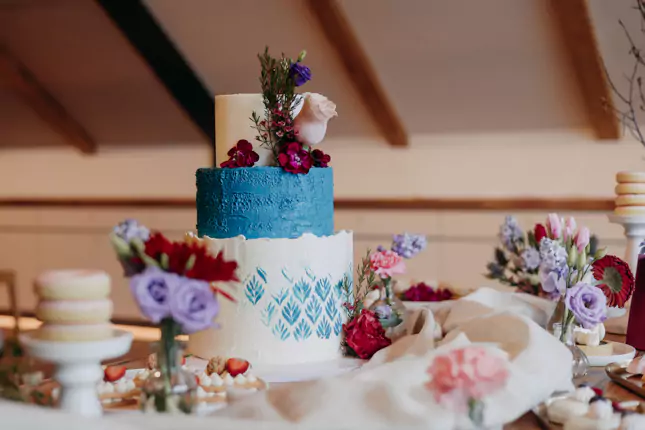 Ob beim Paarshooting am See oder während der freien Trauung: Das Brautpaar zeigt sich vertraut und selbstbewusst. Genauso stark und authentisch wirkt auch die Floristik mit den ausgewählten Blumen in Lila, Rot und Rosa. Dieser stimmungsvollen, mutigen Farbwelt nehmen sich auch die Patisserie und Papeterie an: Erdbeertörtchen, abgerundete Tisch- und Menükarten in Dunkelrot und mit filigraner Typografie, sowie jede Menge kleine, feine Deko-Details machen das Gesamtbild dieser Hochzeit stimmig und schön.