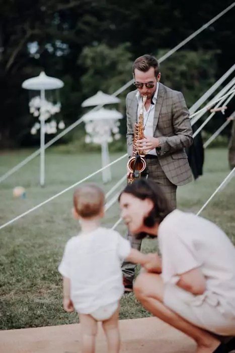 Headliner des Tages ist natürlich das Brautpaar – er in seinem legeren, blauen Sommeranzug und sie in ihrem knöchellangen Brautkleid, zu dem sie bequeme Sandalen mit niedrigen Absätzen trägt. Die Gäste tragen stilecht Festivalbändchen und werden auch mit einem Festivalpass ausgestattet.