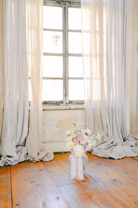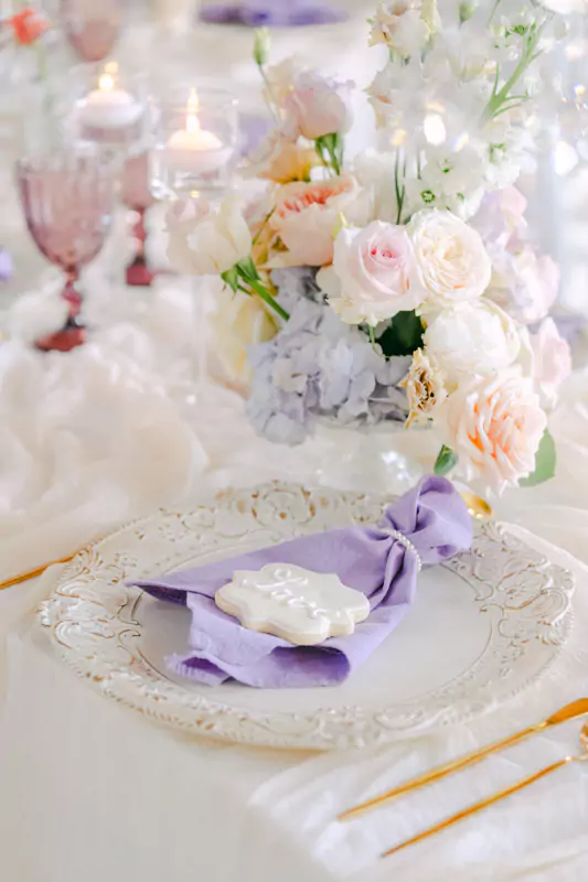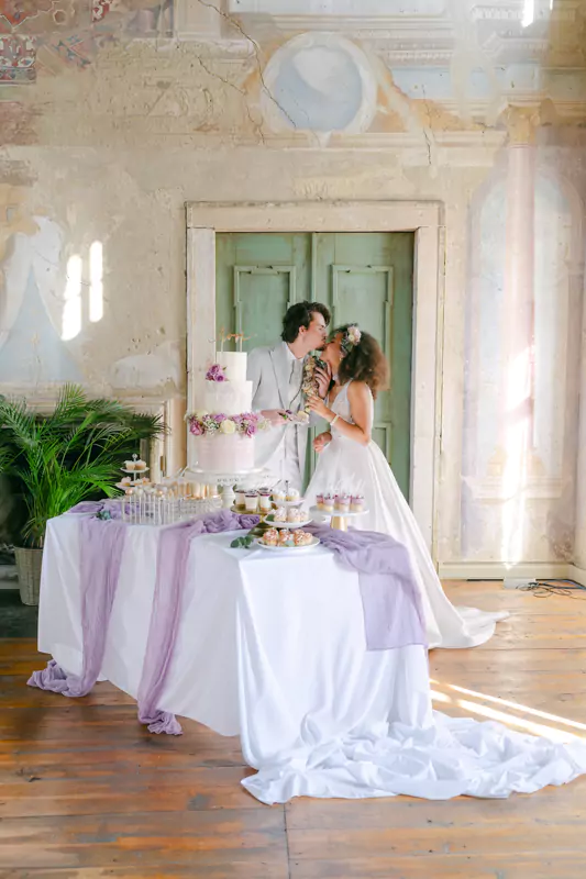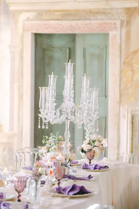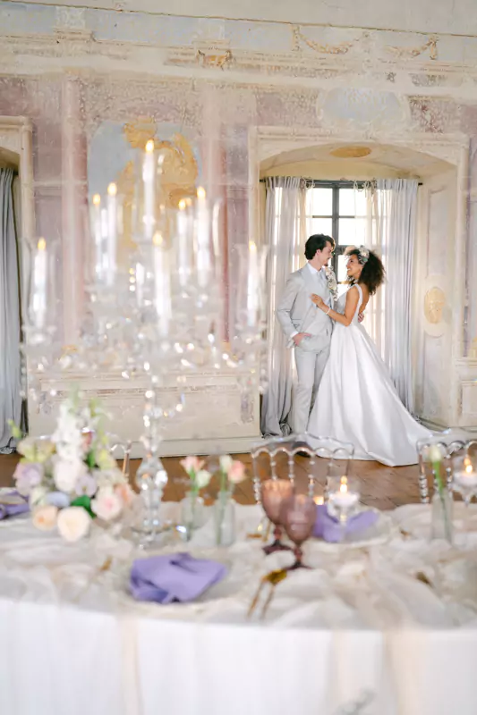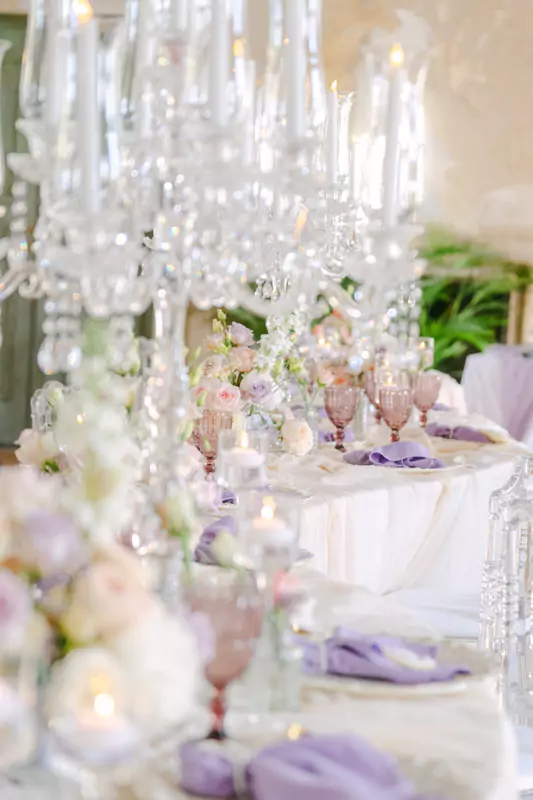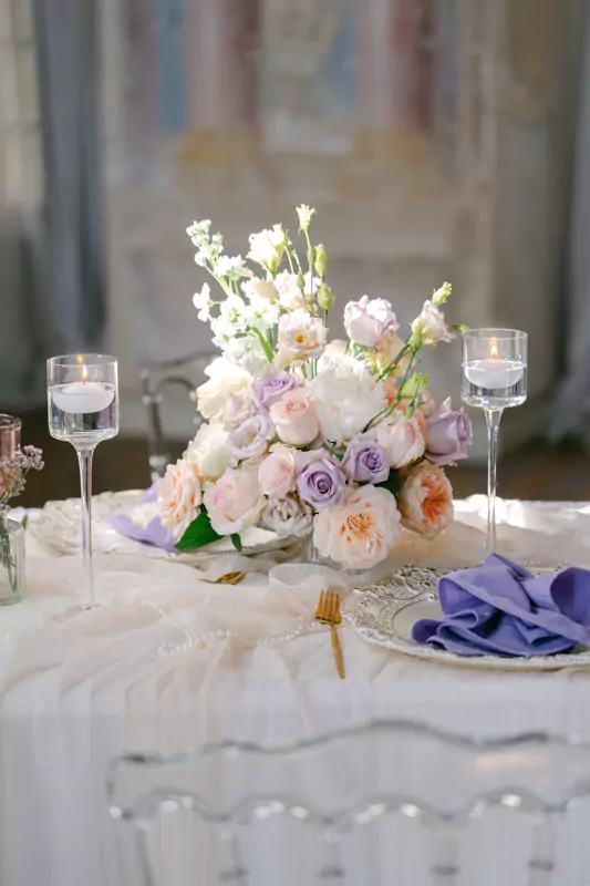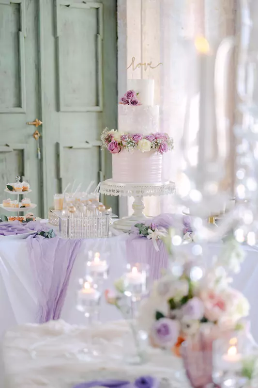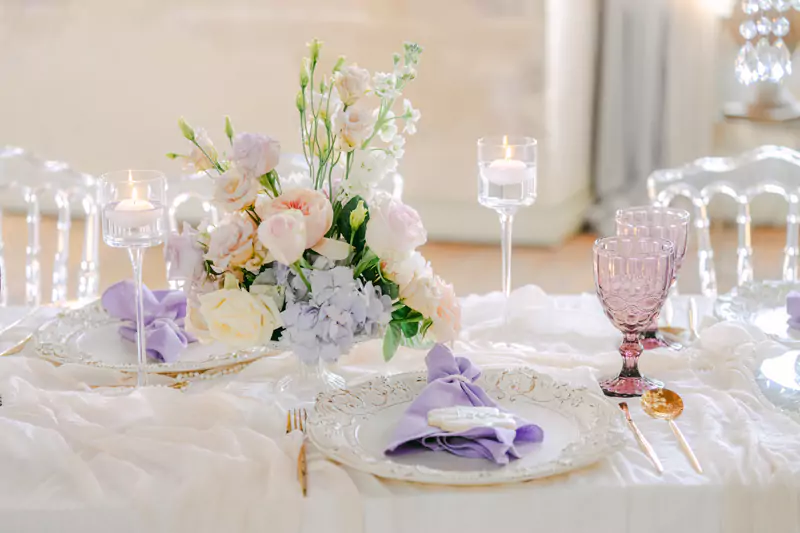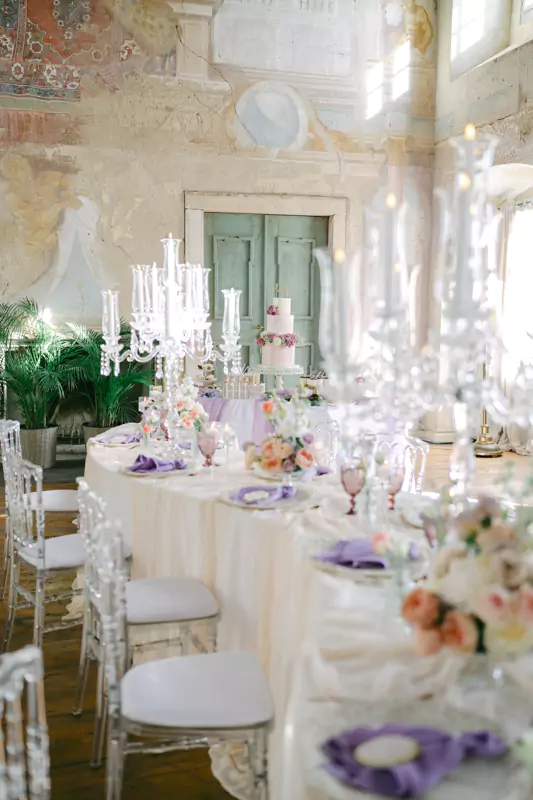 Die geschwungene Festtafel erstrahlt in zarten Lavendel- und Rosétönen – eine harmonische Farbkomposition, die natürliche Eleganz mit einem Hauch von Nostalgie vereint. Jedes Detail ist liebevoll arrangiert: von der filigranen Hochzeitspapeterie mit nostalgischem Flair bis hin zu historischen Elementen, die wie Relikte einer längst vergangenen Zeit wirken.