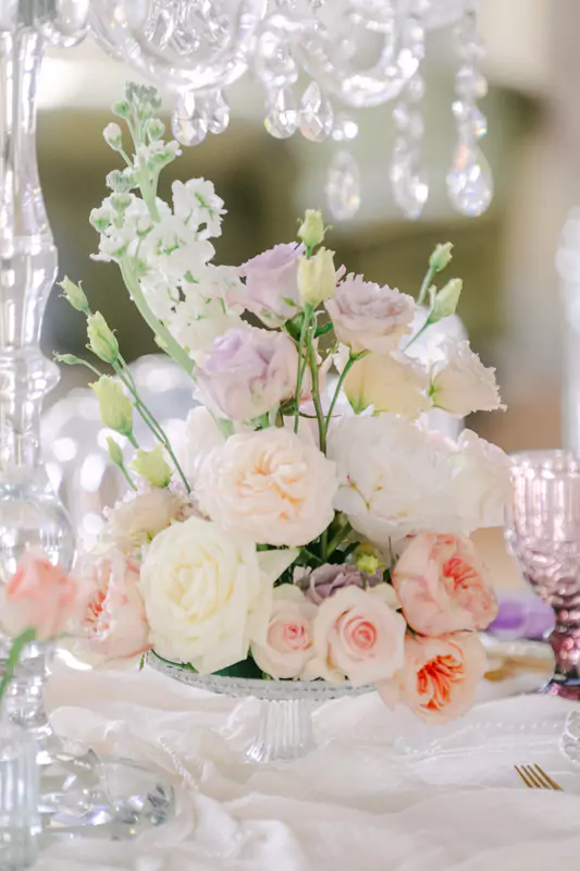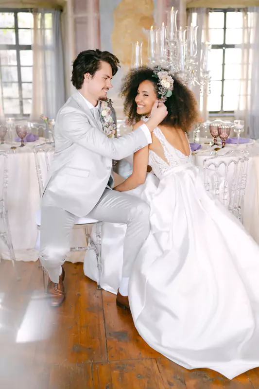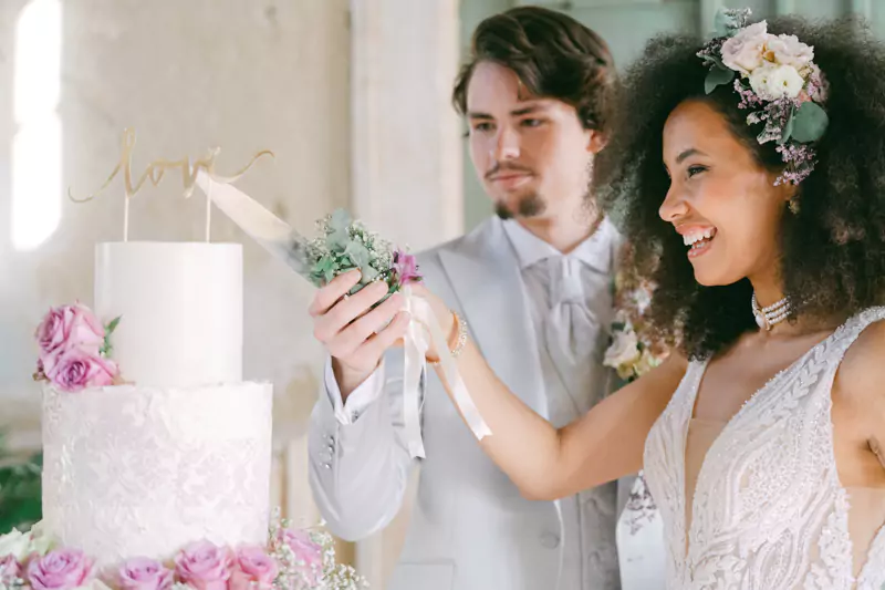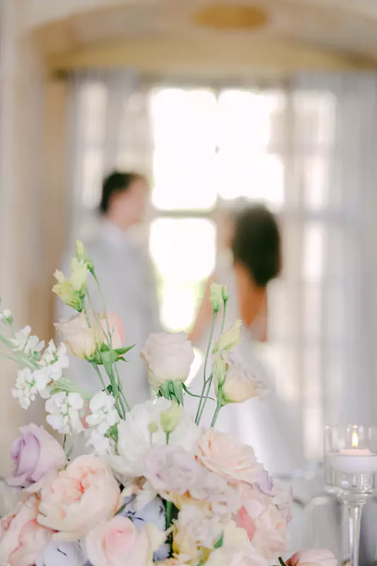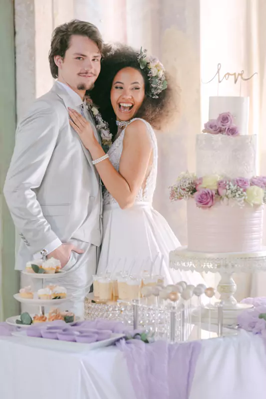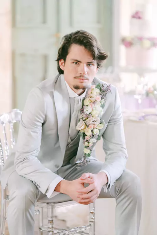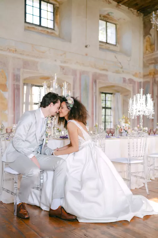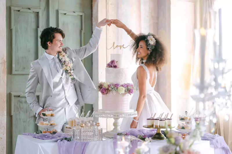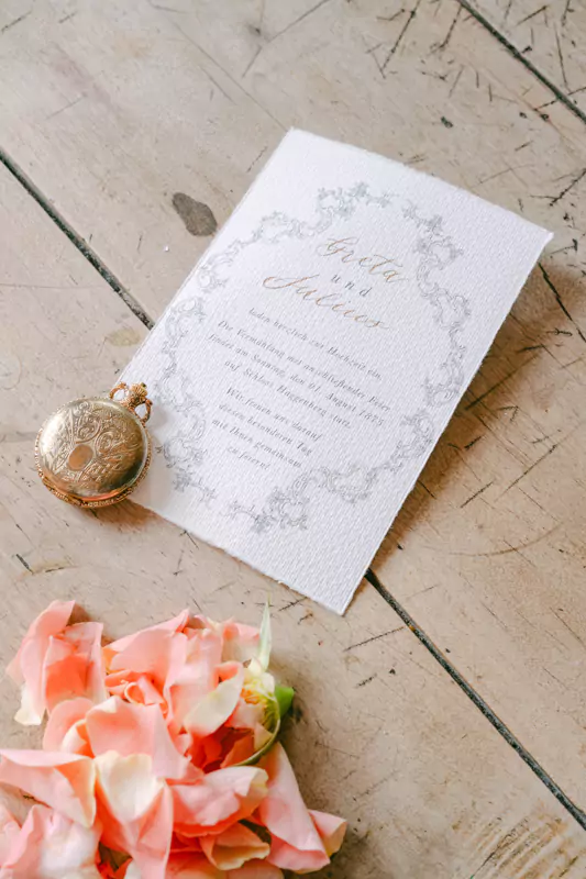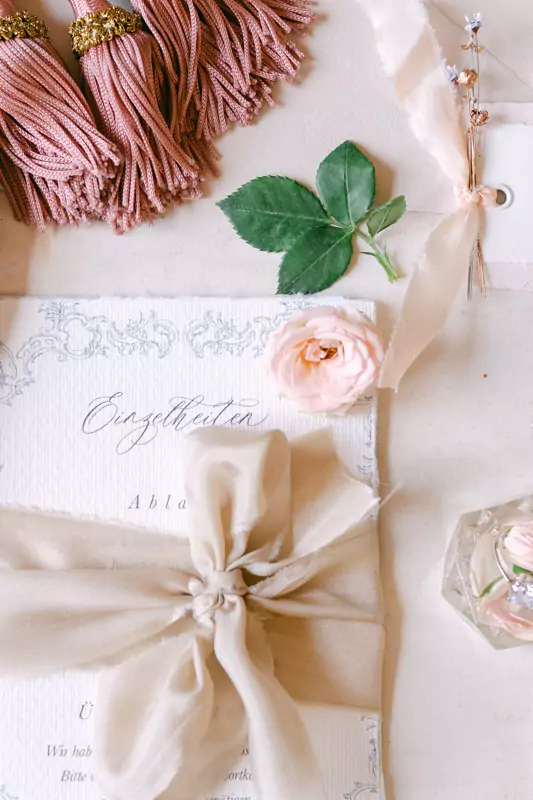 Die geschwungene Festtafel erstrahlt in zarten Lavendel- und Rosétönen – eine harmonische Farbkomposition, die natürliche Eleganz mit einem Hauch von Nostalgie vereint. Jedes Detail ist liebevoll arrangiert: von der filigranen Hochzeitspapeterie mit nostalgischem Flair bis hin zu historischen Elementen, die wie Relikte einer längst vergangenen Zeit wirken.