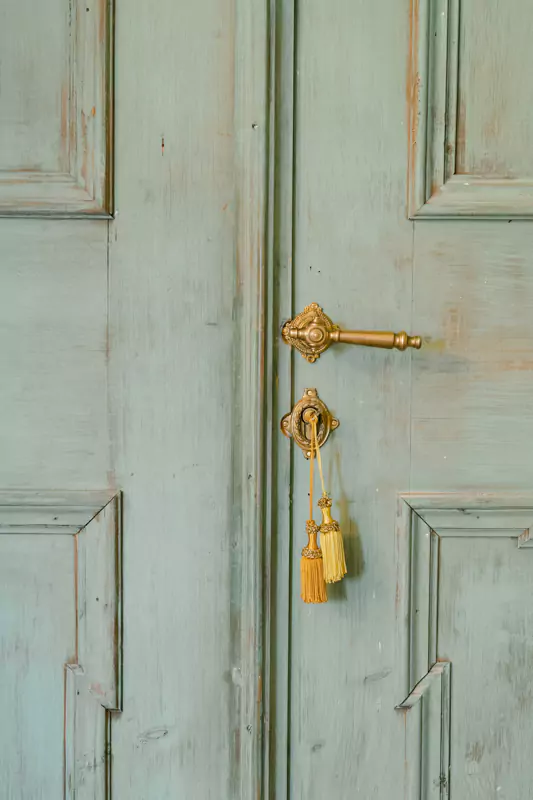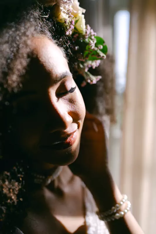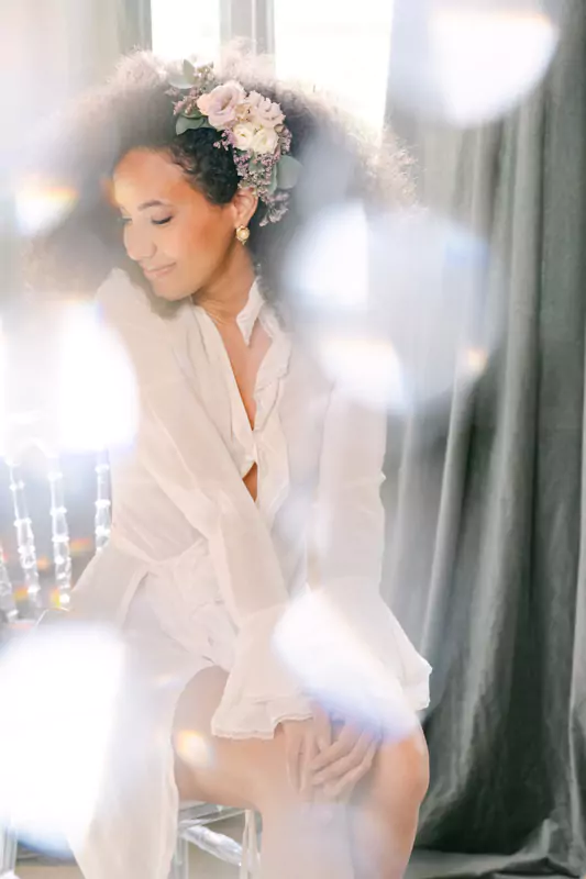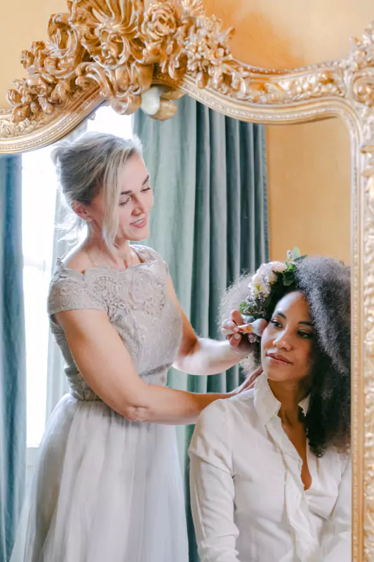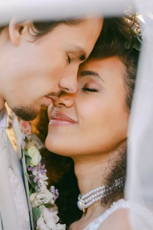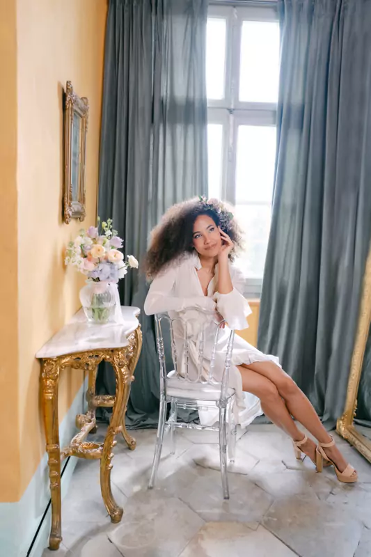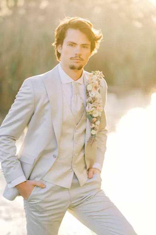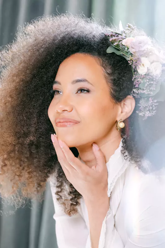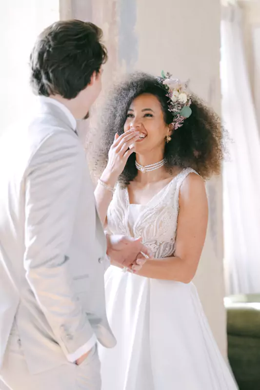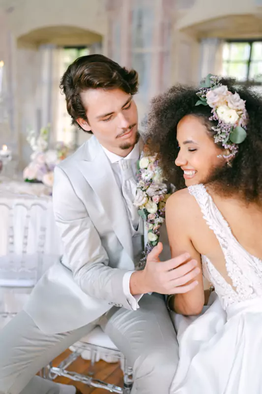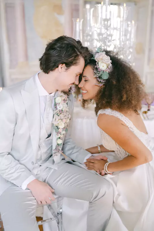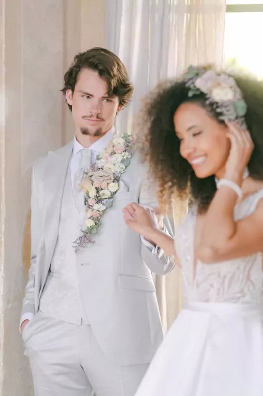Der Moment scheint stillzustehen, als das Brautpaar den Raum betritt. Sie haben nur Augen füreinander. Der Bräutigam trägt einen eleganten, grauen Anzug mit floral dekoriertem Revers, während die Braut mit ihren offenen Naturlocken und einem zarten Choker aus Perlen verzaubert. Ihr Brautkleid wirkt modern und zugleich anmutig – ein stilvoller Kontrast zur historischen Hochzeitslocation.