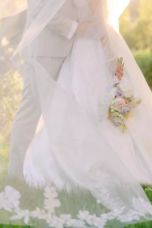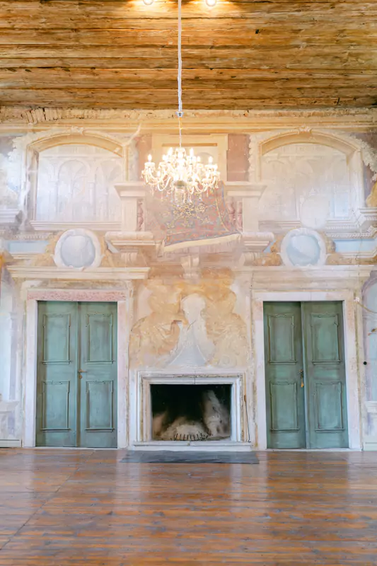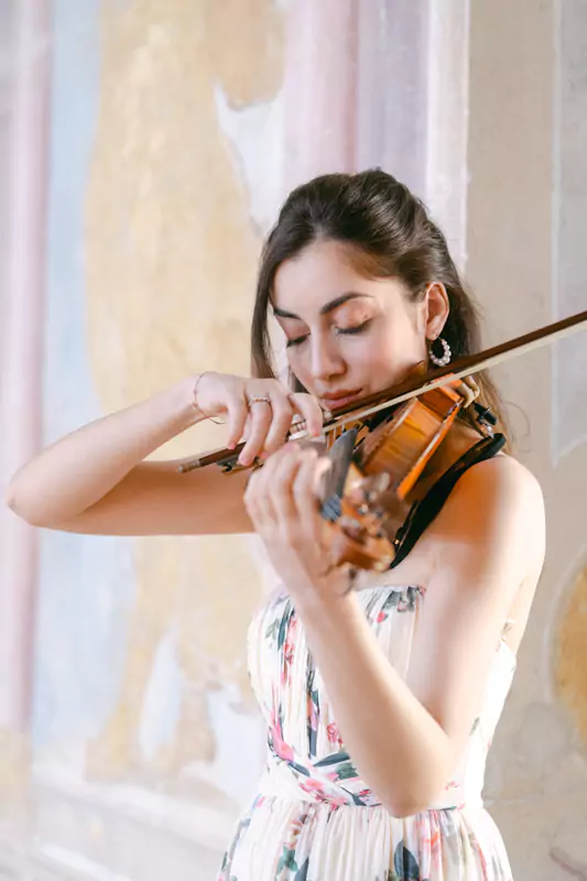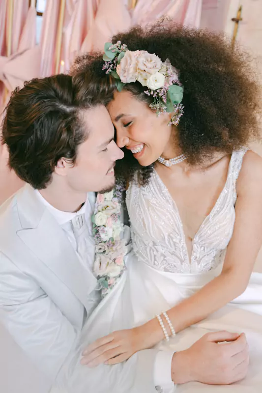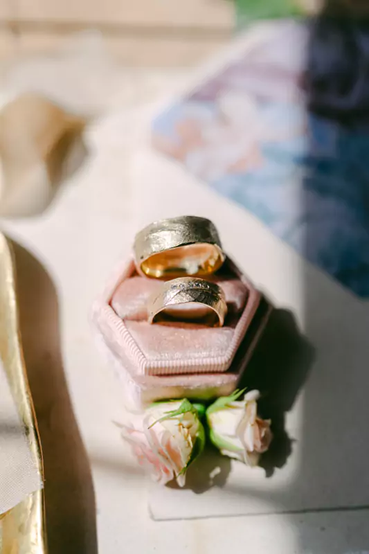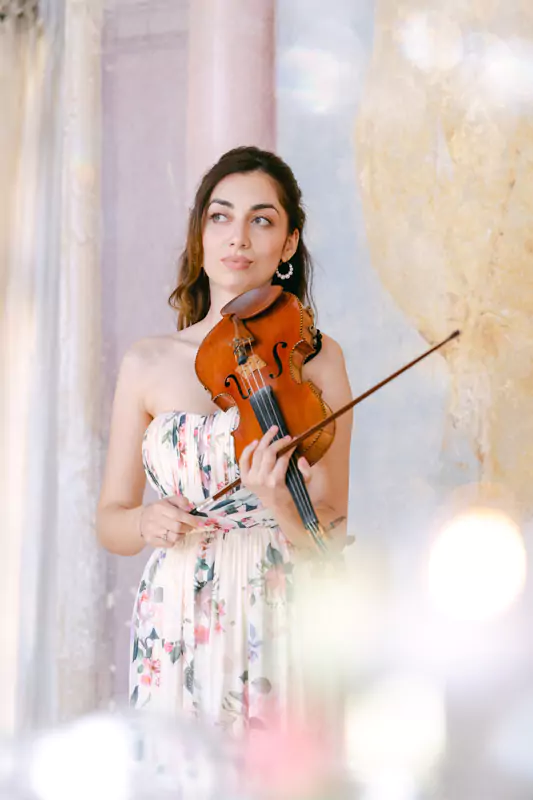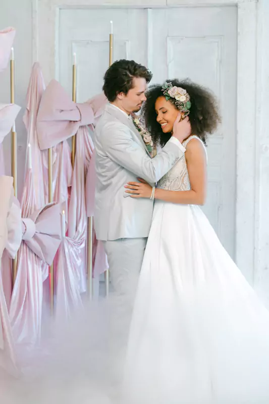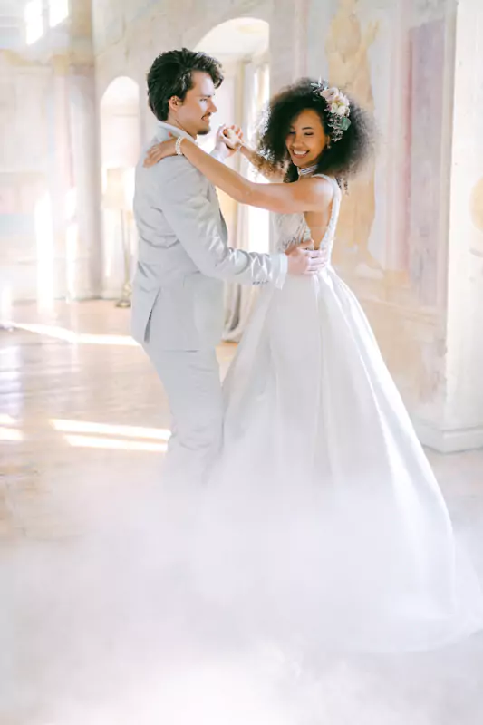Ebenso auffällig wie geschmackvoll: große, rosa Schleifen als dekorative Highlights. Sie setzen ein modisches Statement inmitten der traditionsreichen Umgebung. Das Paar tanzt verliebt im Takt der Geigenklänge – eine Szene wie aus einem Hochzeitsmärchen. Alles wirkt wunderbar echt und doch wie ein liebevoll inszenierter Hochzeitstraum.