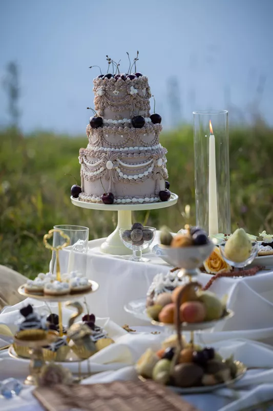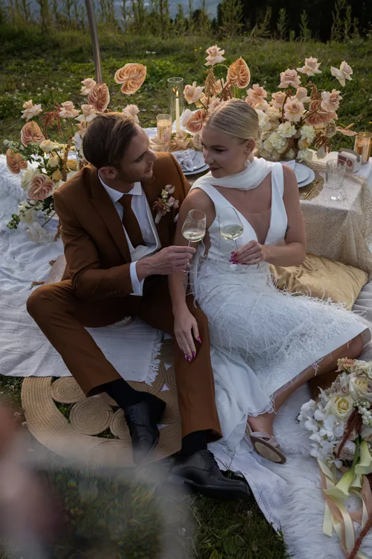 Dieses Elopement am Patscherkofel ist alles andere als schlicht oder gar improvisiert. Noch immer hält sich der Mythos, Elopements wären spontane, wenig glamouröse Feiern. Wie falsch diese Annahme ist, zeigt dieses wunderschöne Luxury Picnic: Auf knapp 2.000 Höhenmetern, mit Blick auf die Tiroler Alpen, entstand dieses stimmige Hochzeitssetting. Das junge Brautpaar wünschte sich neben einer intimen Feier auch einen Hauch von exklusivem Luxus. In Österreich sind luxuriöse Elopement-Picnics bislang kaum verbreitet, doch diese Hochzeit könnte das ändern. Denn dieses Picknick besticht durch Ästhetik, Raffinesse und Genuss.