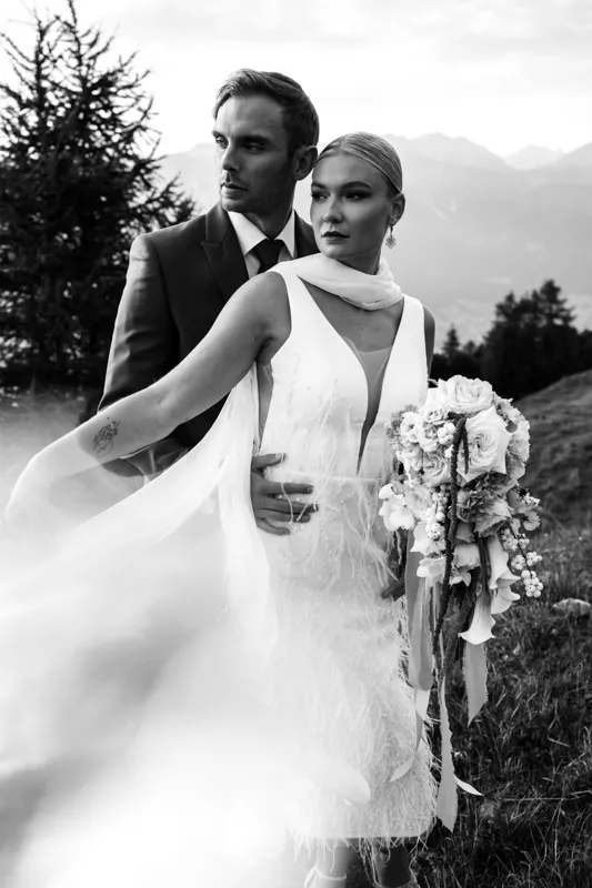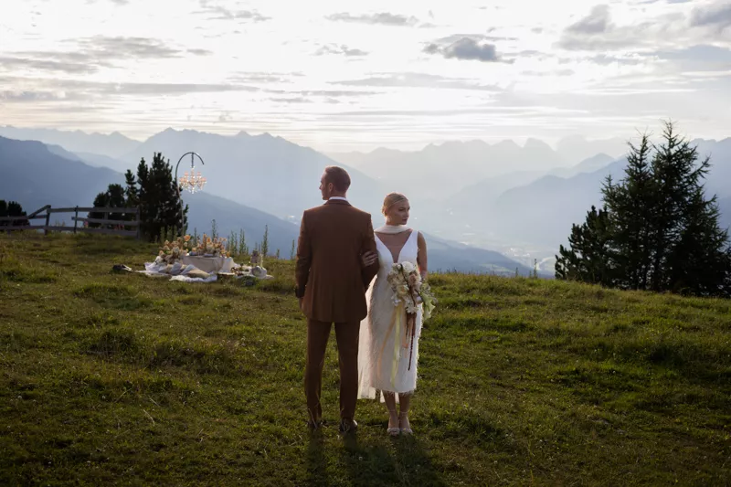 Die Braut hat sich für ihr Elopement etwas Opulenz gewünscht: „Überall soll es glänzen!“ Und dies ist bei diesem Wedding-Elopement durchaus gelungen. Das Pailletten-Brautkleid, die glitzernde Tischdecke und hübsche Glasdiamanten setzen glamouröse Akzente inmitten der Natur. Und über all dem schwebt das Hochzeitshighlight: ein echter Kristallluster! Was für das Hochzeitsteam logistisch herausfordernd war, wird im Abendlicht zum eindrucksvollen Blickfang: Sein Leuchten auf 2.000 Metern Höhe schafft eine ganz besondere, romantische Stimmung.