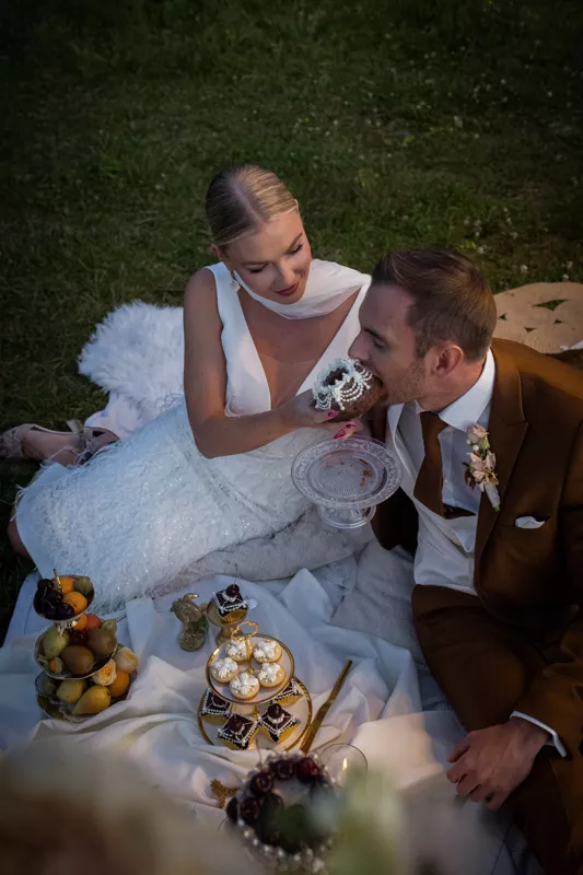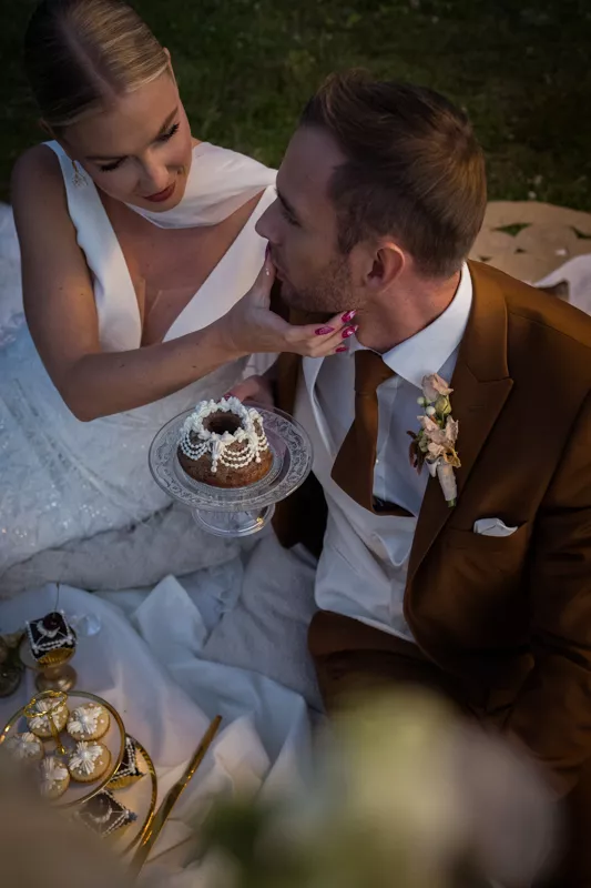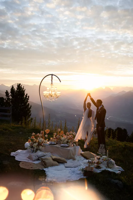 Das Brautpaar schmiegt sich in die weichen Kissen, genießt die süßen Pâtisserie-Kreationen, stößt mit gekühltem Champagner auf sein Glück an und betrachtet gemeinsam den malerischen Sonnenuntergang am Patscherkofel.