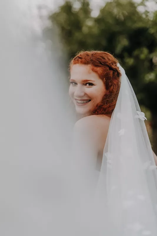 Die Braut trägt ein Offshoulder-Hochzeitskleid mit einem langen Schleier, auf dem zarte weiße Blüten wie vom Wind gestickt wirken. Ihre roten Locken sind leicht geflochten und verleihen ihr einen natürlichen, romantischen Look. Der Bräutigam tritt in legerer Eleganz vor die Gäste: graue Hochzeitsanzughose, weißes Hemd, auffällig gemusterte Hosenträger und ein cooler Man-Bun.