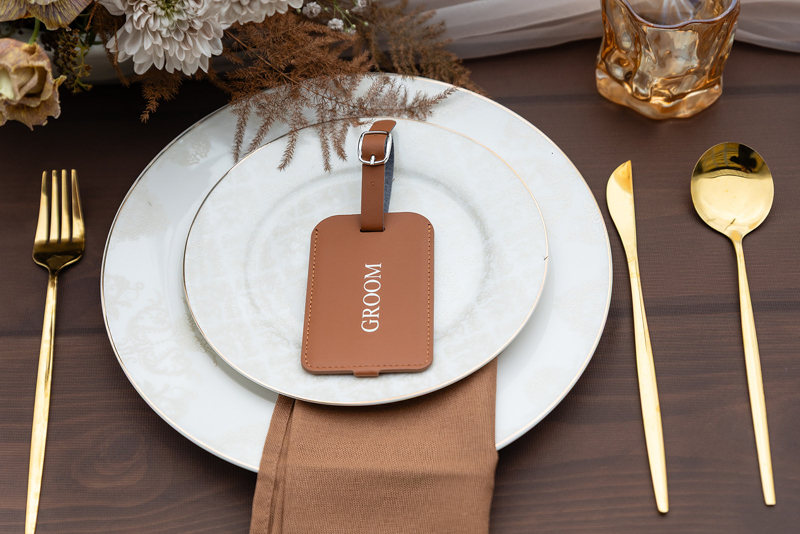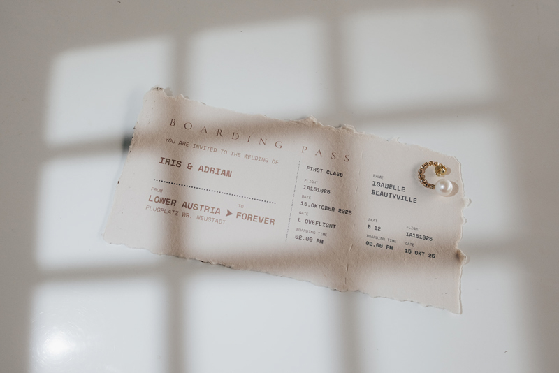 Das Farbkonzept aus Ivory, Creme und Blush zieht sich durch die gesamte Hochzeit – von Rosen und Schleierkraut in der Hochzeitsfloristik bis zur Dekoration der runden Hochzeitstische, die organisch im Raum angeordnet sind. Die Papeterie im Boarding-Card-Design greift das Flugthema charmant auf: Die Destination lautet liebevoll „Forever“!