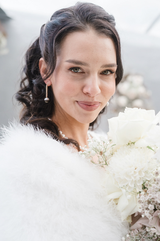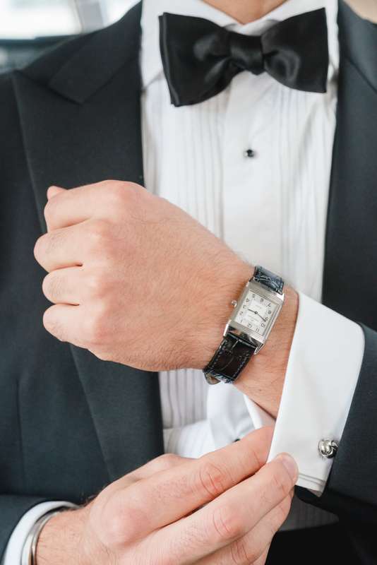 Ein weiteres Highlight bildet die mehrstöckige Hochzeitstorte mit floralen Blush-Akzenten und dem Tortentopper „Better Together“, ergänzt durch einen Sweet Table mit feinen Desserts und goldenen Details. Die Braut trägt ein schlichtes, fließendes Kleid mit zartem Kunstfell-Überwurf, der Bräutigam einen klassischen schwarzen Anzug mit Fliege und moderner Brille.