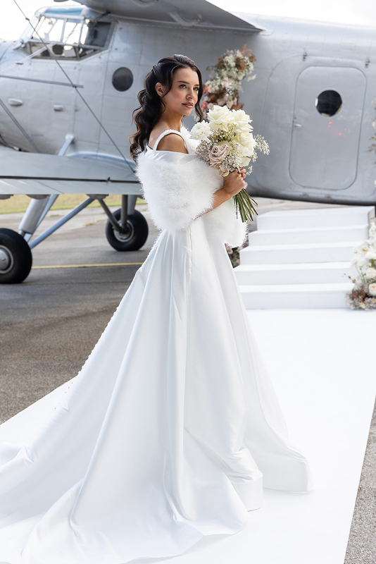 Wer hoch hinaus will, wählt für den Hochzeitsstag einen Hangar voller industriellem Charme und verleiht ihm mit Stoffen, Blumen und organischen Tafeln eine wohlige, warme Atmosphäre. So lautet die Antwort auf die Frage „ready to take off?“ ganz entspannt: „Cleared for takeoff into married life!“