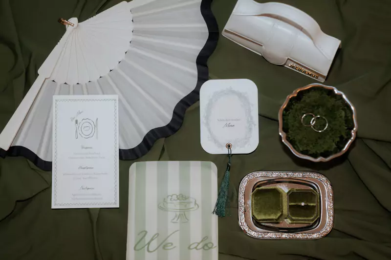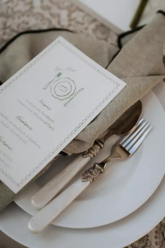 Im Mittelpunkt dieser Hochzeit steht ein Farbkonzept aus verschiedenen Grüntönen – fast monochrom, aber voller Tiefe und Nuancen. Die Farbwelt wird getragen von klaren Linien, grafischen Mustern und einem Spiel aus Struktur und Textur. Streifen, als zentrales Designelement, ziehen sich durch das gesamte Konzept und schaffen eine moderne, fast editoriale Atmosphäre.