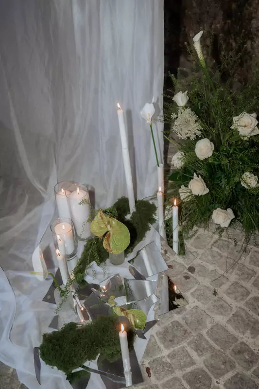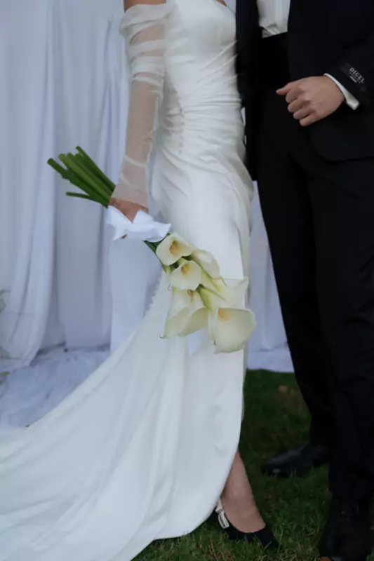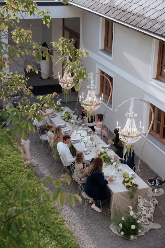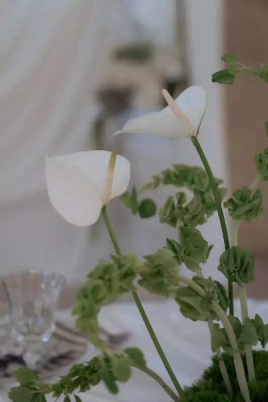 Floraler Star des Hochzeitskonzepts ist die Calla: eine Blume, die mit ihrer klaren Form und zeitlosen Eleganz perfekt zum puristischen Gesamtkonzept passt. Ob im Brautstrauß oder in der Tischdekoration: Die Calla setzt charakterstarke Akzente und betont den hochwertigen Look. Ergänzt wird die Hochzeitsfloristik durch frisches Moos, verspiegelte Säulen und moderne Papierschirme – Elemente, die dem Setting Tiefe und Leichtigkeit zugleich verleihen.
