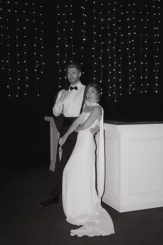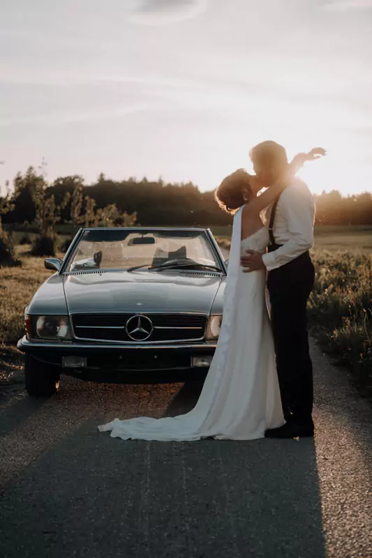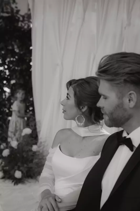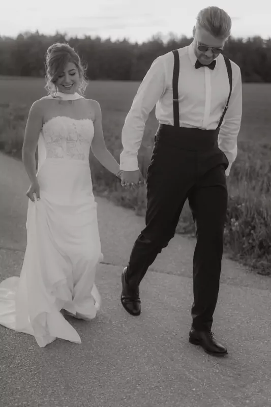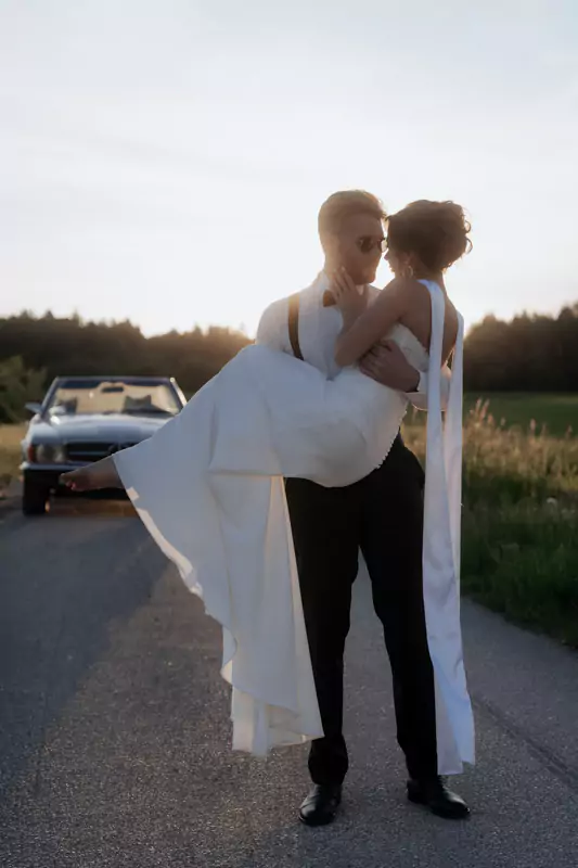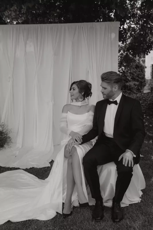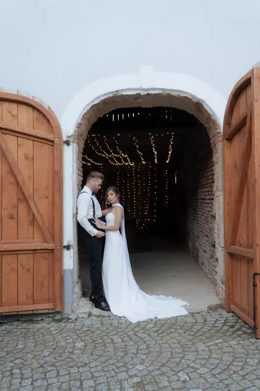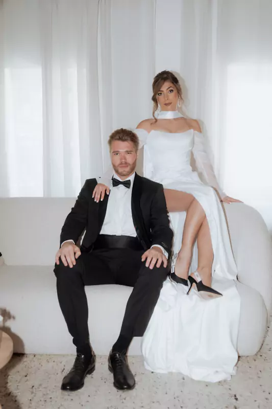 Auch das Hochzeitsstyling überzeugt durch Kontraste: Der Bräutigam trägt einen klassischen Smoking – elegant, stilvoll und zeitlos. Die Braut hingegen zeigt moderne Lässigkeit. Ihr Hochzeitskleid mit Beinschlitz wird durch eine locker umgelegte Stola ergänzt, die dem Look eine entspannte Raffinesse verleiht.