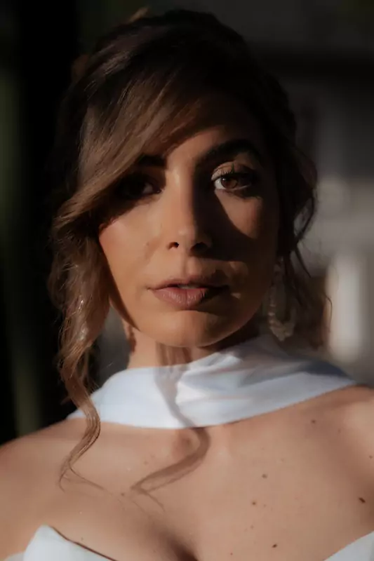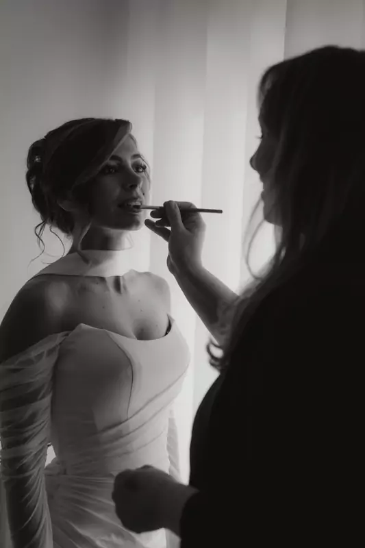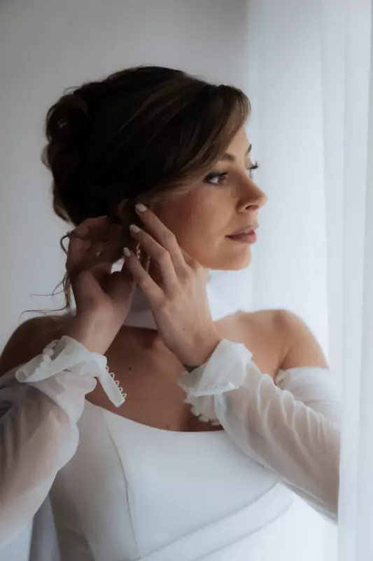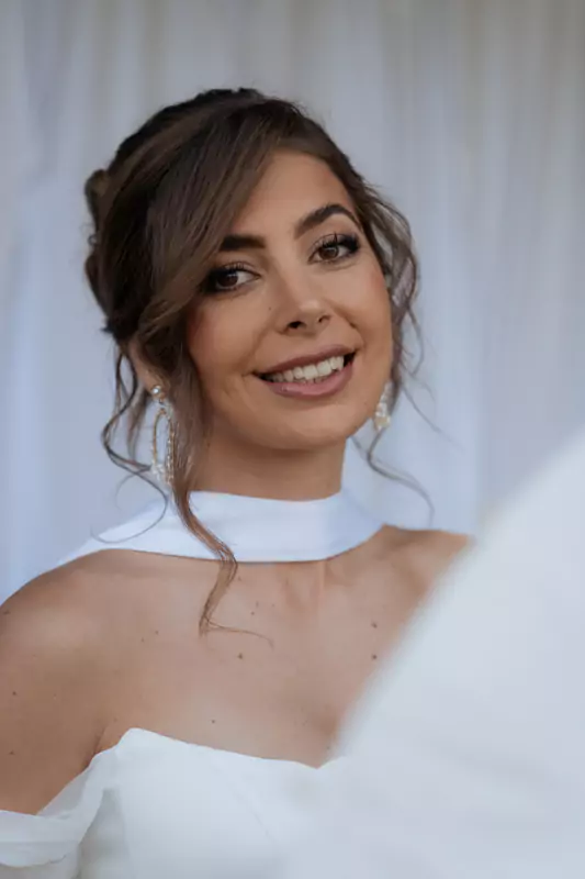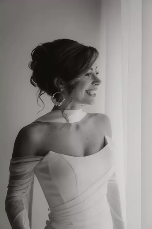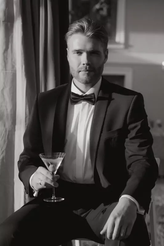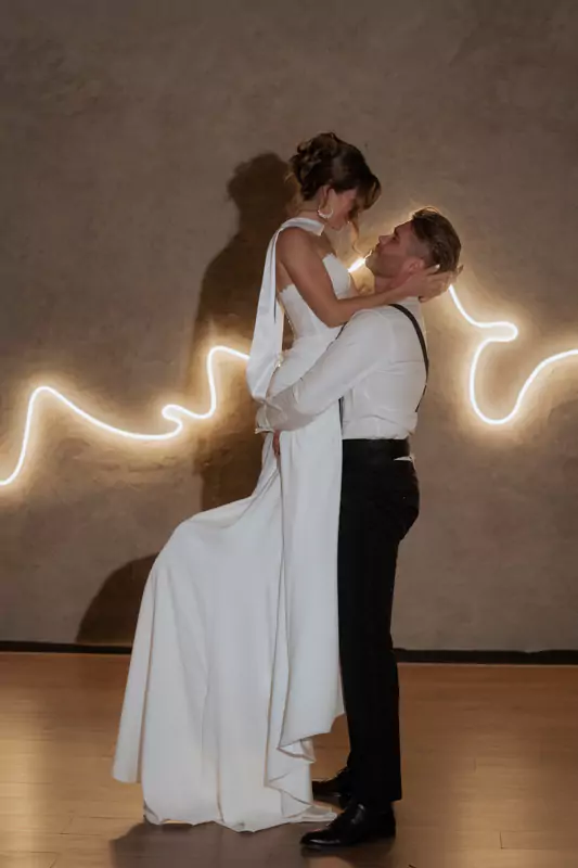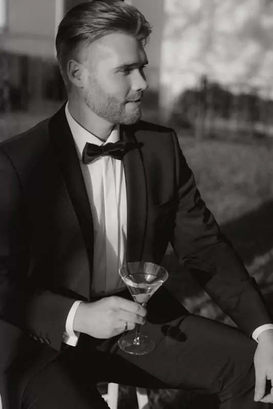 Auch das Hochzeitsstyling überzeugt durch Kontraste: Der Bräutigam trägt einen klassischen Smoking – elegant, stilvoll und zeitlos. Die Braut hingegen zeigt moderne Lässigkeit. Ihr Hochzeitskleid mit Beinschlitz wird durch eine locker umgelegte Stola ergänzt, die dem Look eine entspannte Raffinesse verleiht.
