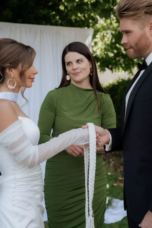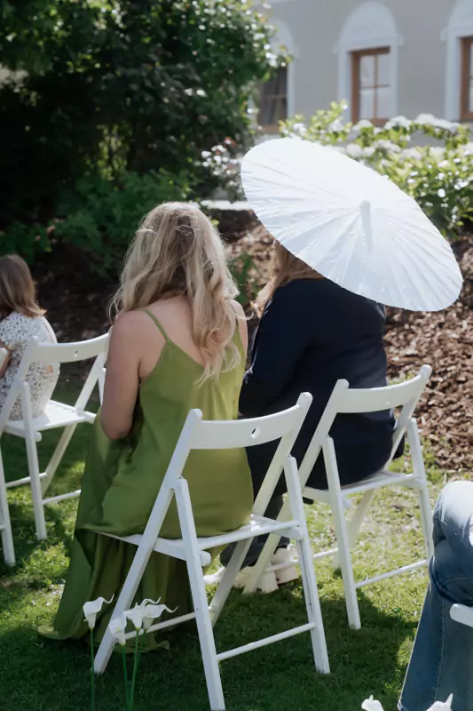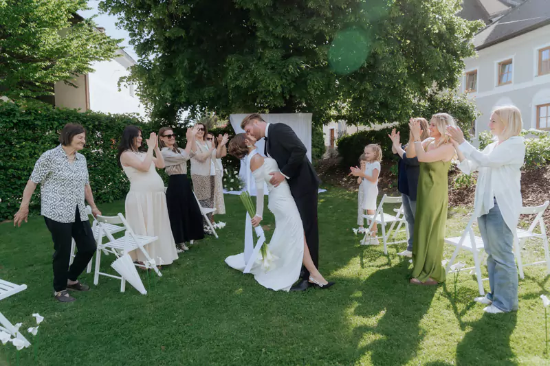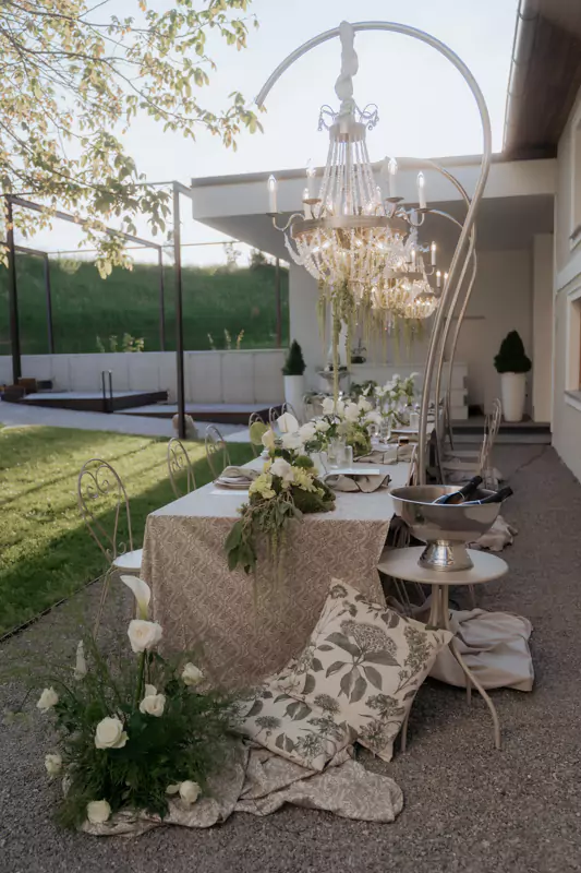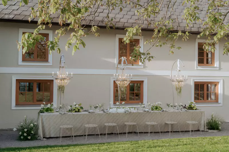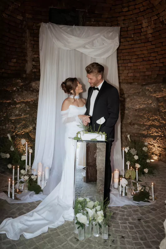 Die Hochzeitsdekoration folgt dem Prinzip der Reduktion: Ein seidig glänzender Stoff wird kunstvoll auf dem Tisch drapiert und sorgt für luxuriöse Haptik. Der Traubackdrop greift diese Ästhetik auf. Mit großzügig inszeniertem Stoff entsteht eine feierliche Kulisse, die sowohl modern als auch emotional wirkt. Ob unter freiem Himmel im Grünen oder indoor vor alten Gemäuern – der Look bleibt konsequent elegant und zeitgemäß.