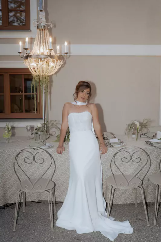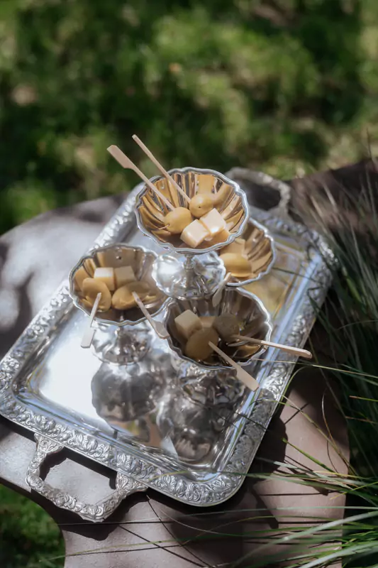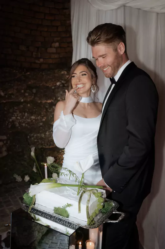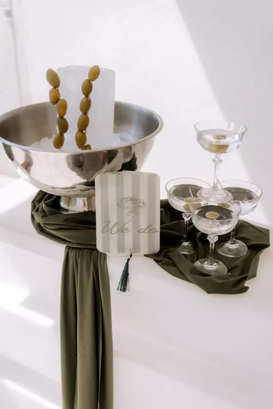 Kulinarisch überrascht das Shooting mit coolen Foodtrends. Ein dekorativer Eisblock, feine Oliven und kleine Geschmackserlebnisse setzen stylische Akzente auf dem Sweet Table und zeigen, wie Hochzeitscatering heute neu gedacht werden kann. „Verdant Vision“ ist ein visuelles Statement. Es zeigt, wie sich Natürlichkeit, Design und Zeitgeist in einem modernen Hochzeitskonzept vereinen lassen: klar, elegant und inspirierend bis ins Detail.