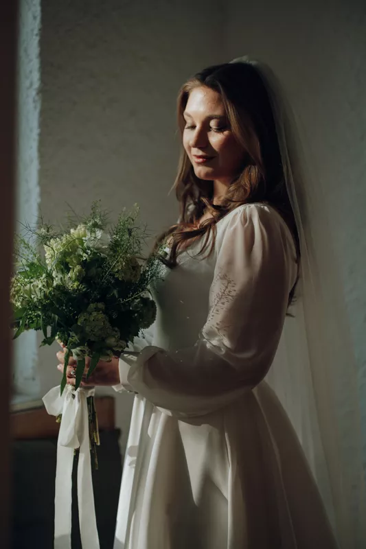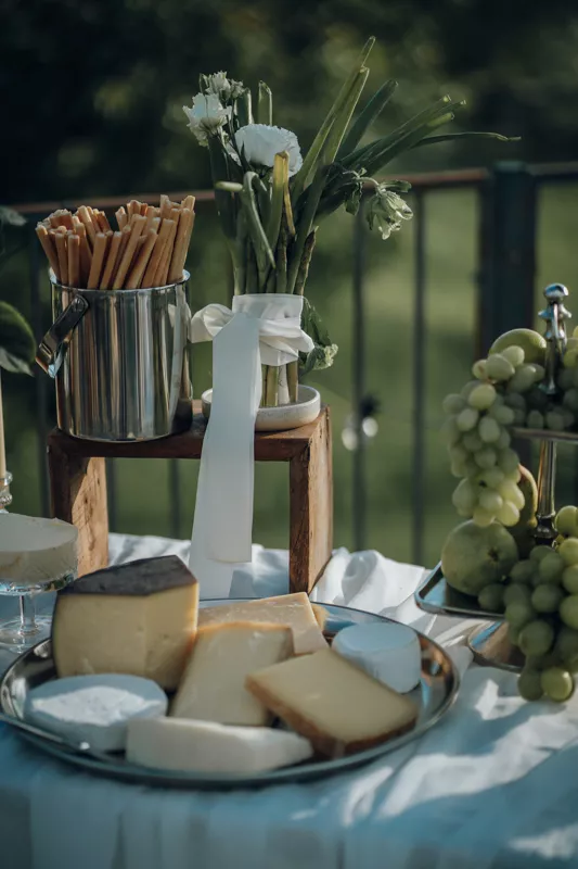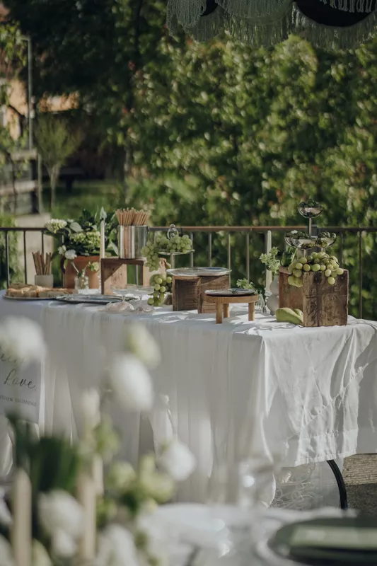 Mit zarten Grüntönen, feinen Schleifendetails und floralen Illustrationen zieht sich das Hochzeitskonzept wie ein grüner Faden durch das gesamte Styling. Die Hochzeitspapeterie wirkt elegant und verspielt zugleich, die Hochzeitsfloristik bleibt bewusst wild-romantisch – ergänzt durch natürliches Obst und Gemüse, das sich harmonisch in die Hochzeitsdekoration einfügt. Frühlingszwiebeln werden zu Vasen, grüne Oliven, Käse und Brot verschmelzen am Sweet Table mit der Gesamtästhetik.