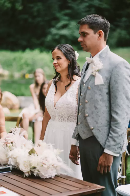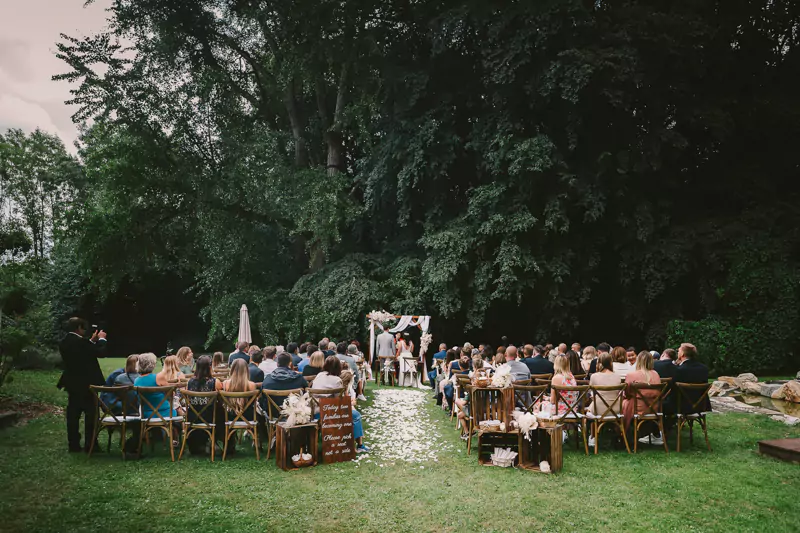 Bei der Trauung entscheiden sich Sabrina und Jörg für einen Traubogen aus Holz, geschmückt mit Blumengestecken und weißen Stoffen. Den Weg zum Altar beschreitet das Brautpaar über ein Meer aus weißen Rosenblättern, gesäumt von wunderschönen Holzstühlen, die mit passenden Blumenarrangements geschmückt sind. Das Setting im Garten des prachtvollen Schloss Nikitsch zeigt sich an diesem Tag einfach magisch: Vor dem grünen Wald und einem eindrucksvollen, großen Baum besiegeln Sabrina und Jörg mit zitternden Stimmen ihr Ja-Wort. Sie versprechen sich, aufeinander aufzupassen und immer füreinander da zu sein. Ein Moment, der vielen Gästen die Tränen in die Augen treibt – wie gut, dass Taschentücher für Freudentränen bereitstehen. Zum Abschluss der Trauungszeremonie dürfen sich die Gäste Konfetti und Seifenblasen nehmen und das frisch vermählte Brautpaar hochleben lassen. Wie schön, wenn alles so harmonisch und natürlich zusammenspielt und das Brautpaar – ganz egal wohin es auch blickt – einfach nur pure Freude in den Gesichtern der Gäste sieht!