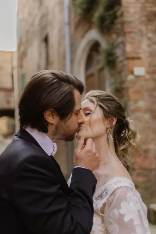 Die Toskana steht für sanfte Hügel, weitläufige Weinberge und – natürlich – das abwechslungsreiche, wunderschöne Meer. Doch für eine Destination-Hochzeit eignen sich nicht nur die bekannten Spots der Region. Gerade das toskanische Hinterland bietet pure italienische Idylle: versteckte, beinahe verschlafene Dörfer, verwinkelte Gassen und historische Mauern. Genau solch einen authentischen Ort sucht dieses Brautpaar – und wird fündig.