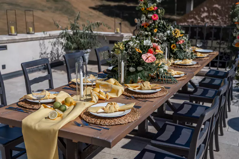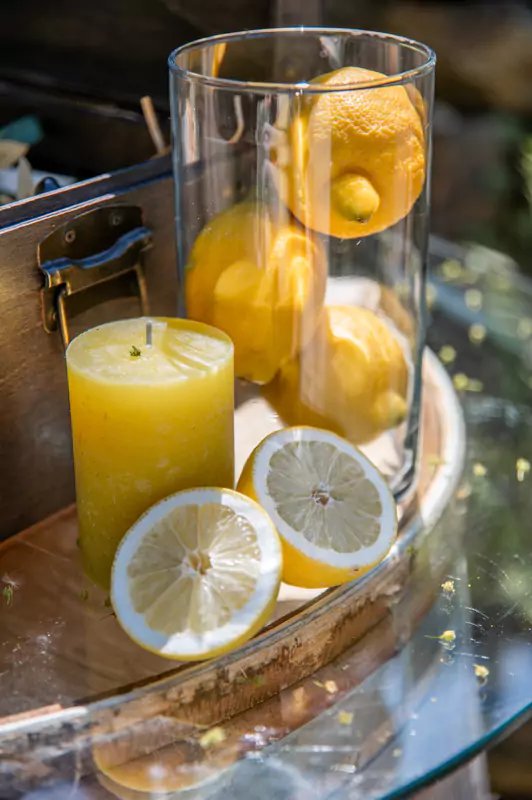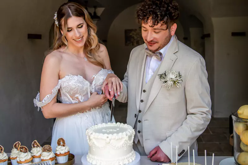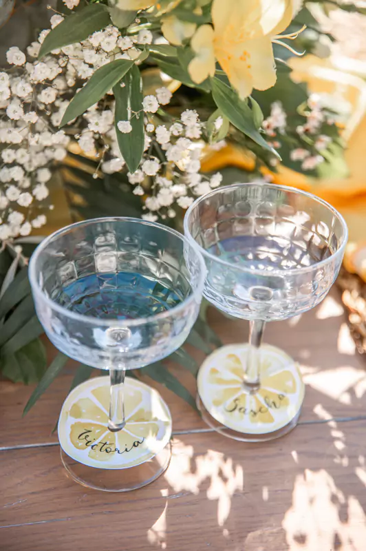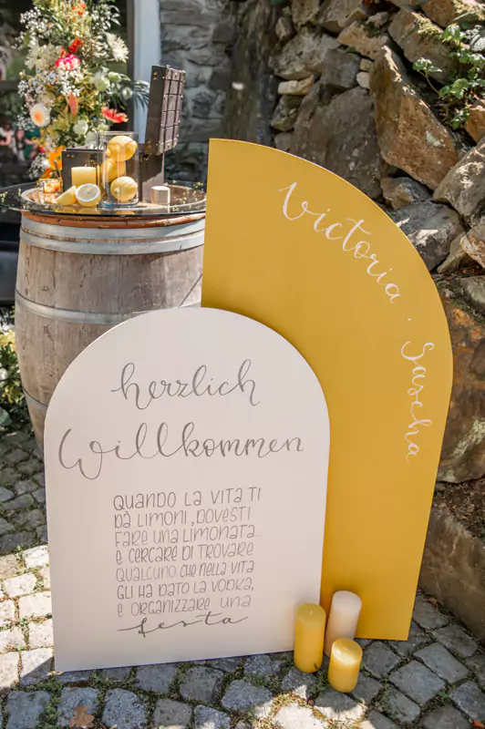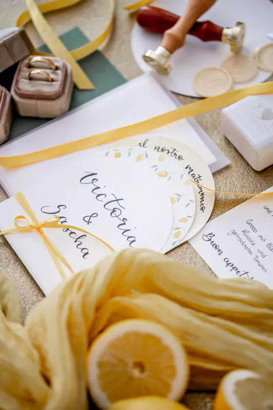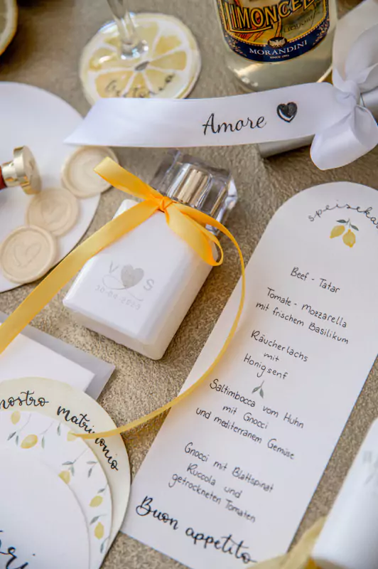 Ein echtes Highlight bildet die Hochzeitspapeterie: Die liebevollen Zitronen-Illustrationen ziehen sich durch das gesamte Designkonzept. Menükarten, Einladungen und Siegel tragen die persönliche Handschrift der Hochzeit – verspielt und jeweils in sonnigem Gelb akzentuiert. Am festlich gedeckten Tisch lebt das mediterrane Hochzeitsgefühl weiter auf. Die Menükarte verspricht puren Genuss: Saltimbocca, Gnocchi mit Blattspinat, Tomate-Mozzarella mit frischem Basilikum – kulinarisch wird die Hochzeit zur Reise durch Italien. Auch der Sweet Table ist ein Augenschmaus: Frische Zitronen, zarte Blüten und süße Versuchungen treffen hier aufeinander. Die Hochzeitstorte hingegen ist im feinen Vintage-Stil gehalten, fügt sich aber dennoch harmonisch ins Gesamtbild ein. Noch dazu erwartet die Gäste Zitronenlimonade, Prosecco und eine Champagner-Pyramide – es bleibt immer ein wenig Zeit, um die Gläser zu heben und sich zuzuprosten: „Salute – Alla Vita!
