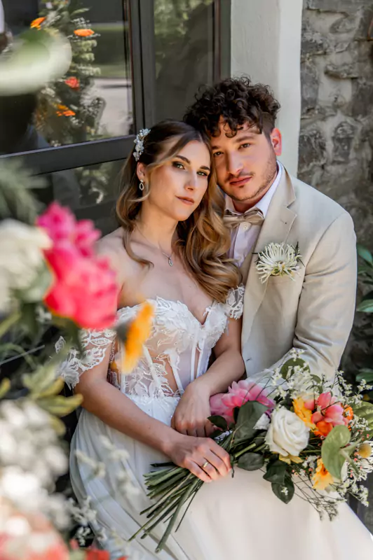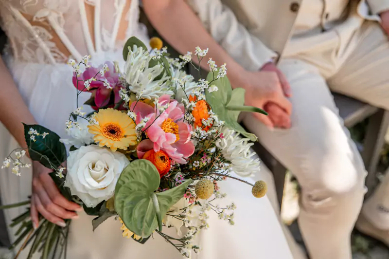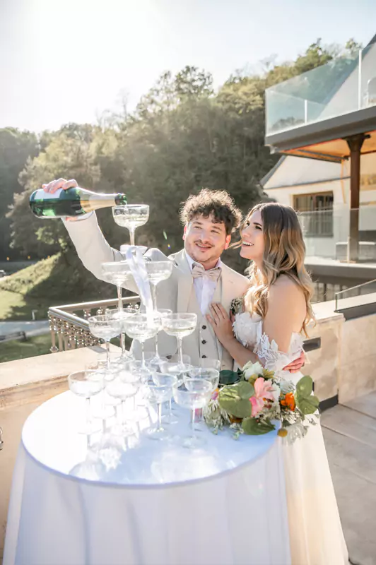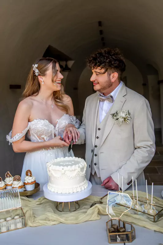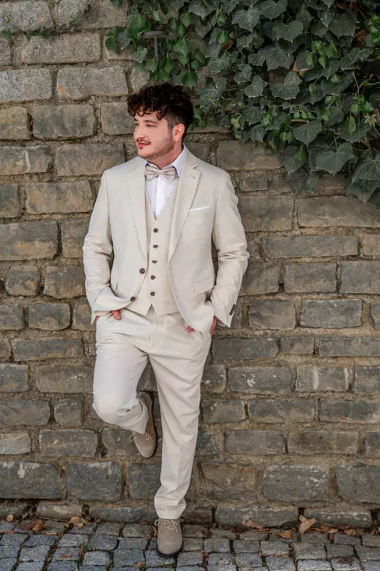 Die Braut trägt an ihrem großen Tag ein zartes, fließendes Brautkleid mit verspielter Corsage und floralen Spitzenapplikationen. Ihr Look ist modern, feminin und dennoch romantisch – perfekt abgestimmt auf das leichte, sommerliche Motto. Der Bräutigam in seinem hellbeigen Hochzeitsanzug mit Weste und offener Fliege verkörpert ebenfalls sommerliche Leichtigkeit.