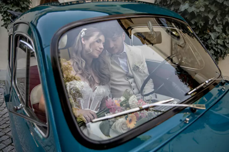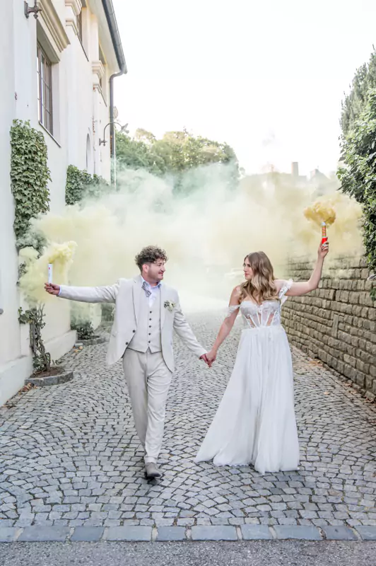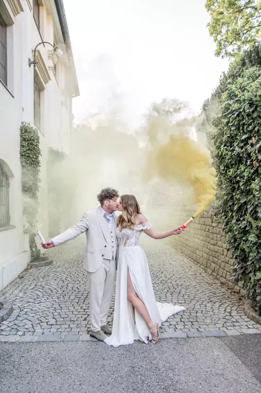 Die Hochzeitslocation inmitten der sanften Hügel der Wachau bietet dank edler Architektur und liebevoll dekorierter Terrasse die perfekte Kulisse für diese mediterran anmutende Hochzeit. Besonders charmant: das süße Hochzeitsauto – ein echter Vintage-Fiat. Das Brautpaar hat gerade so Platz in dem cuten Flitzer, dreht aber kurzerhand und ganz spontan eine kleine Ehrenrunde durch die Gassen. Fürs Fotoshooting eignen sich die schönen Kopfsteinpflaster ideal, daher steigt das Paar aus dem Hochzeitsauto und flaniert Hand in Hand durch die kleinen Gassen, begleitet von gelbem Farbnebel – ein Symbol für die sprühende Lebensfreude dieses besonderen Moments.