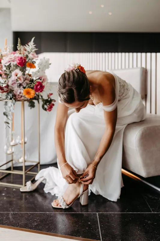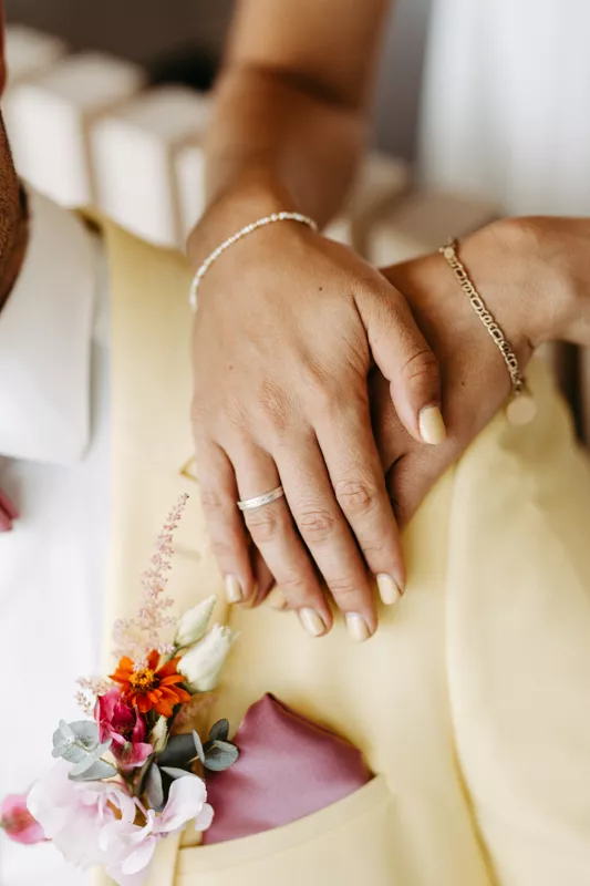 Die freie Trauung ist emotional und leicht. Sie findet eingerahmt von einem floral arrangierten Hochzeits-Traubogen statt. Nach der Vermählung schreitet das Brautpaar über einen sommerlich gemusterten Teppich seinem farbenfrohen Hochzeitsfest entgegen. Die Braut trägt einen Hochzeitszweiteiler mit Off-Shoulder-Top, kombiniert mit grazilem Halsschmuck, Statement-Ohrringen und einer verspielten Herzchen-Sonnenbrille. Ihr Hochzeitsstrauß: große Blüten, leuchtende Farben – ein florales Sommerstatement! Der Bräutigam ergänzt den Look mit hellgelbem Anzug, Fliege und Sneakern. Perfekt, um mit seiner Braut auf der Terrasse durch die Nacht zu tanzen. Die Hochzeits-DJane sorgt mit kosmopolitischer Setlist für coolen Sound und feinste Stimmung.
