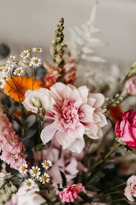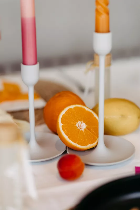 Die Hochzeitsgäste treffen sich in einer von moderner Architektur geprägten Hochzeitslocation, umrahmt von imposanter Naturkulisse. Das Farbkonzept aus Pink, Gelb und Orange erinnert an ein energiegeladenes Sommerfestival und versprüht pure Lebensfreude. Exotisches Obst, farbenfrohe Hochzeitsfloristik und detailverliebte Hochzeitspapeterie bilden das Herzstück der Hochzeitsdekoration. Der Sweet Table und die Cocktailbar locken mit knalligen Macarons und erfrischenden Signature Cocktails aus Wermut und Lemon Peel. Auch die Hochzeitstafel spiegelt das konsequente Farbspiel wider: rosa Kerzen, orange-gelbe Blüten und Obst als Blickfang und kreative Schmuckhalterung.