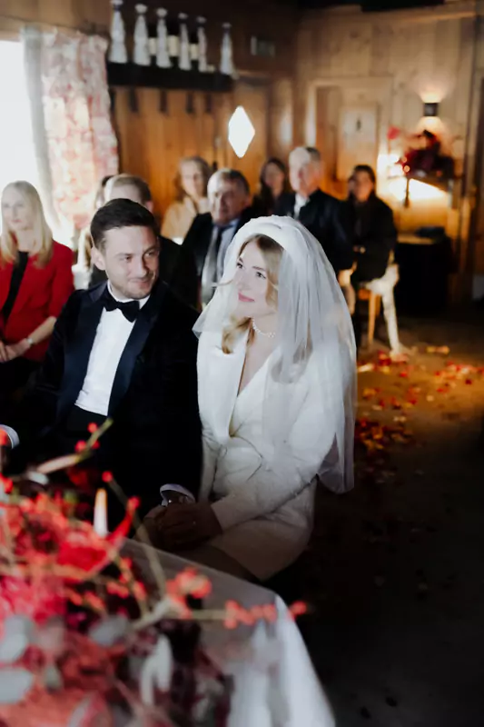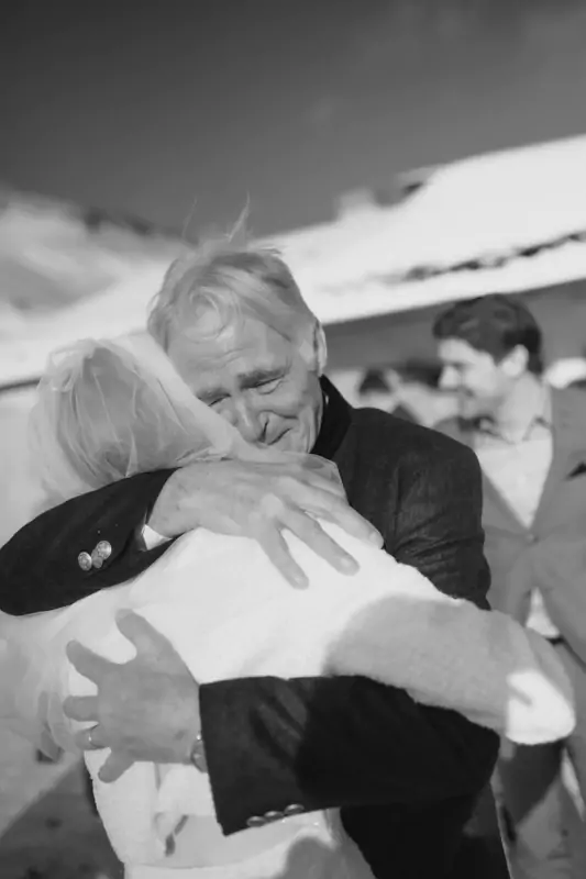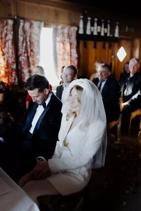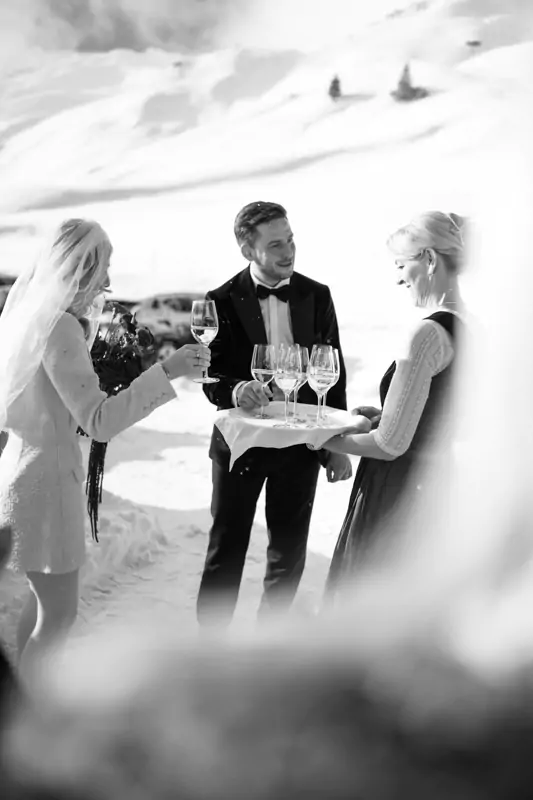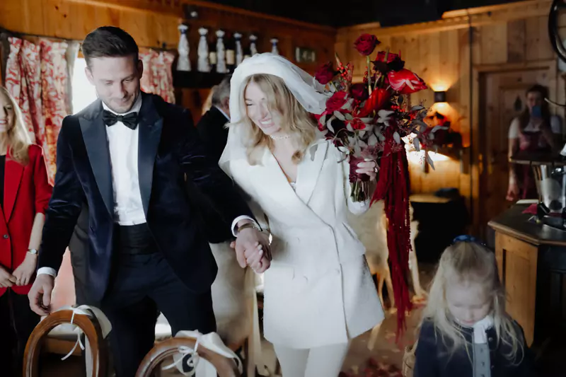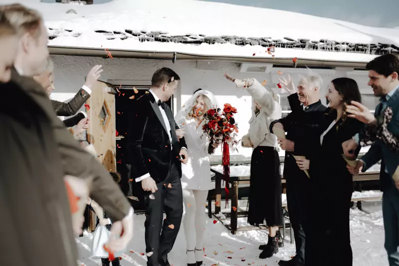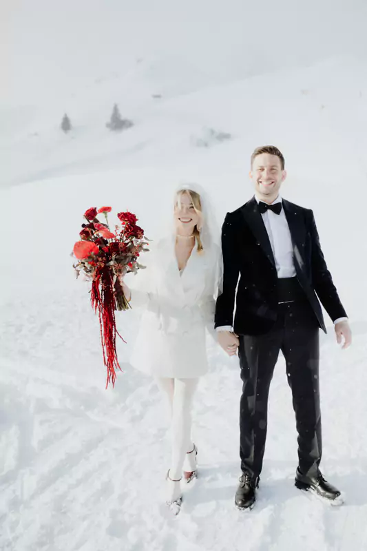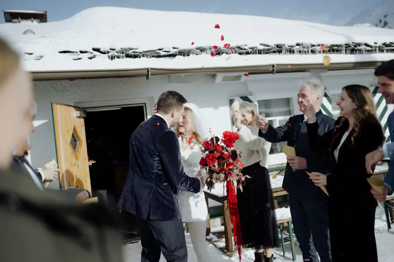 Schneeweiß trifft auf leuchtendes Rot, als der Brautstrauß seine volle Wirkung im Kontrast zu den mit Schnee bedeckten Bergen entfaltet. Und die Noblesse des Brautpaars trifft auf Herzlichkeit und Humor, als im urigen Hüttenambiente geheiratet wird.