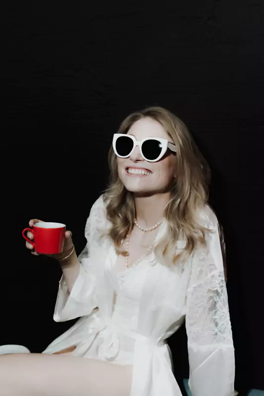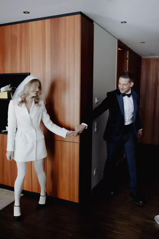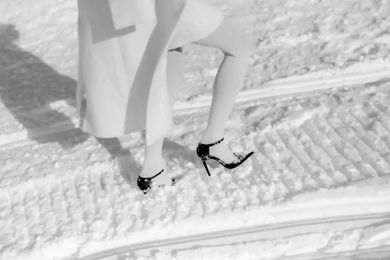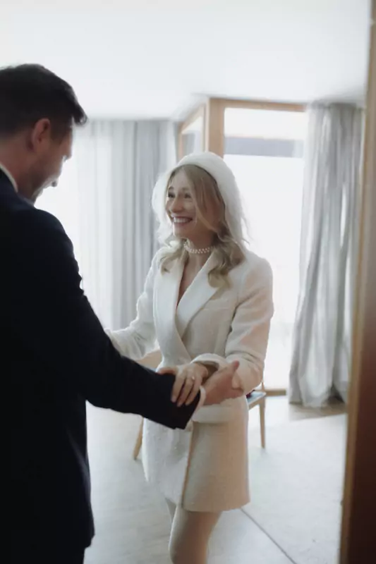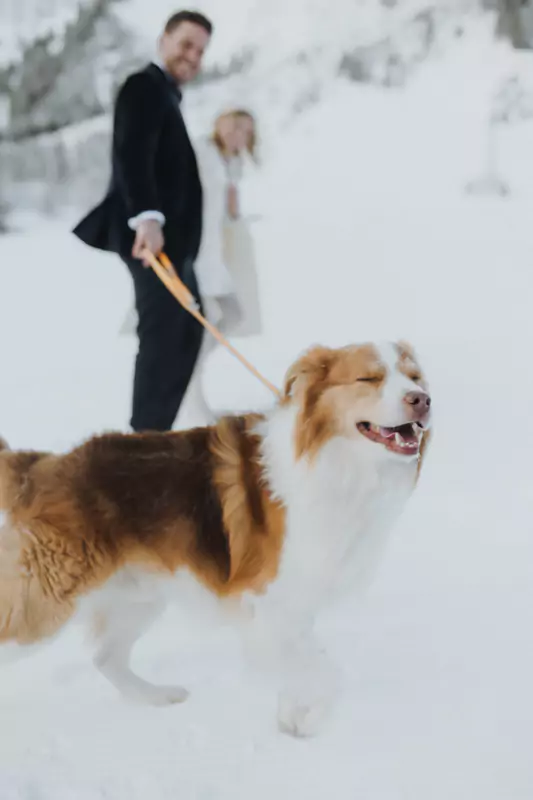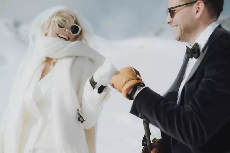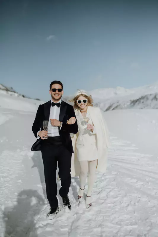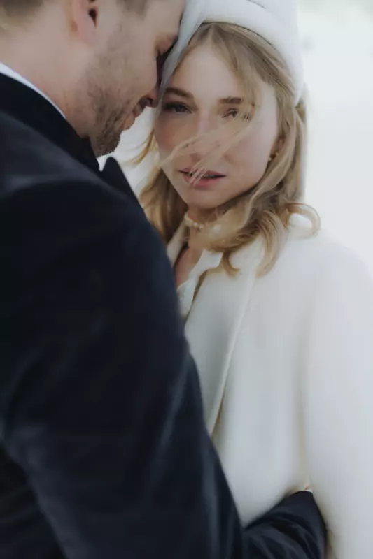 Das Brautpaar präsentiert sich cool wie der Schnee. Ein Blazer-Kleid mit zweireihiger Knopfleiste, eine klassische Perlenkette, dunkelrote High-Heels, ein edler Smoking – die trendigen Outfits und die eindrucksvolle Landschaft lassen einen fast in dem Glauben, alles wäre für ein High Class Fashion-Magazin inszeniert worden. Doch – ihr werdet es nicht glauben: Dies sind Fotos einer realen Hochzeit.