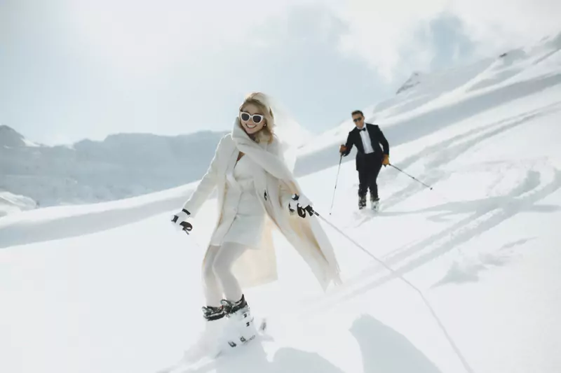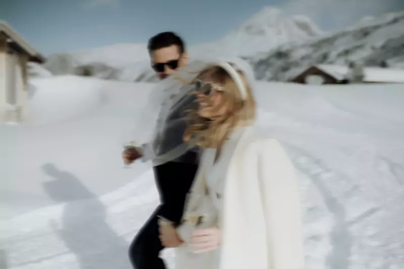 Bestes Wetter, gute Laune – eigentlich der ideale Tag für eine kleine Skiabfahrt! Die Ski sind schnell angeschnallt, und so fährt das frisch vermählte Paar über die verschneiten Hänge einer wunderbaren Zukunft entgegen.