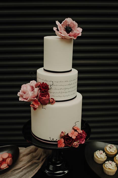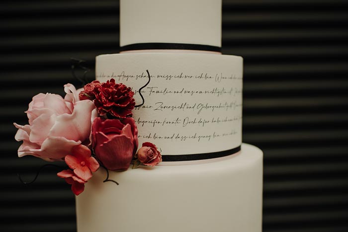 Die minimalistisch eingerichtete Hochzeitslocation gibt dem knalligen und gewagten Farbkonzept den notwendigen Raum, um richtig zu wirken und zugleich die nötige Coolness, um das vermeintliche Tussi-Klischee dieses Farbthemas nichtig zu machen. Die Kombination aus coolem Minimalismus und femininem Farbschema findet sich auch an der edlen Hochzeitstorte wieder, auf welcher sowohl das aufgedruckte Eheversprechen als auch die Zuckerblüten wunderbar zur Geltung kommen. Selbiges gilt für die Papeterie, die von Hand mit Letterpress veredelt wurde. Bei der Tischdekoration sorgen schwarze Akzente für das gewisse coole Etwas, das perfekt mit der Floristik harmoniert.