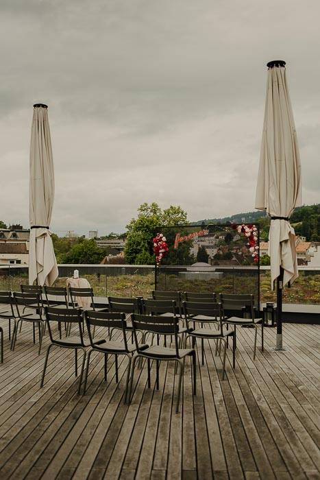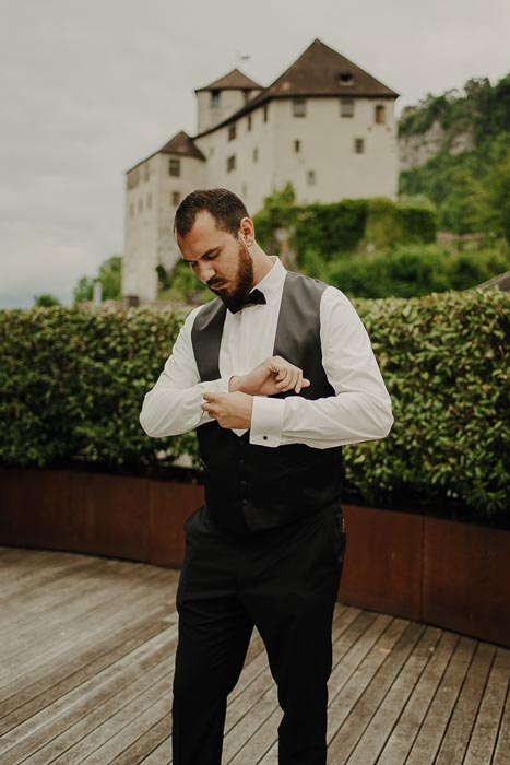 Während der freien Trauungszeremonie bietet die Location einen wundervollen Blick über die mittelalterliche Altstadt Feldkirchs, welche auch als Kulisse für das romantische Paarshooting genutzt wird. Beim plötzlichen Regenguss während des Shootings zeigt sich erneut, dass eine Fine Art Hochzeit nicht bis ins letzte Detail wörtlich zu nehmen ist, denn das Brautpaar ist sich ganz und gar nicht zu fein für das nasse Unwetter.