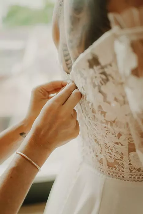 Auch das Brautpaar zeigt, wie zurückhaltend und ästhetisch Fine Art sein kann. Das schulterfreie Brautkleid setzt mit dem weit ausgeschnittenen Rücken die Tätowierungen der Braut in Szene, ohne es an Eleganz missen zu lassen. Diese wird zusätzlich von den satten Farben der Dahlien, Rosen und Pfingstrosen des Brautbouquets untermalt. Auch der klassische schwarze Smoking fügt sich perfekt ins klischeelose Wedding Design ein.