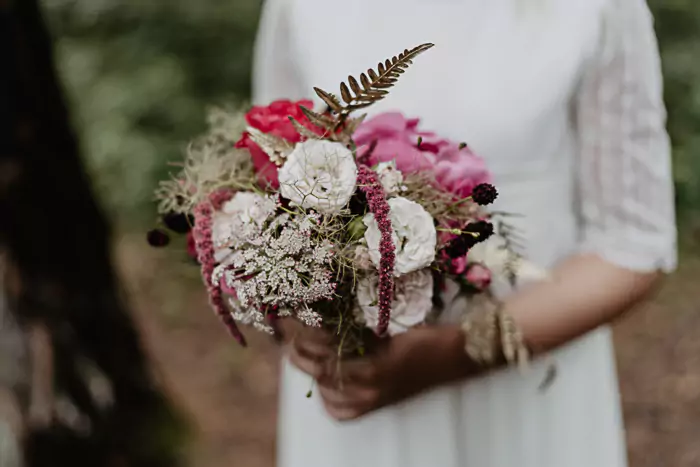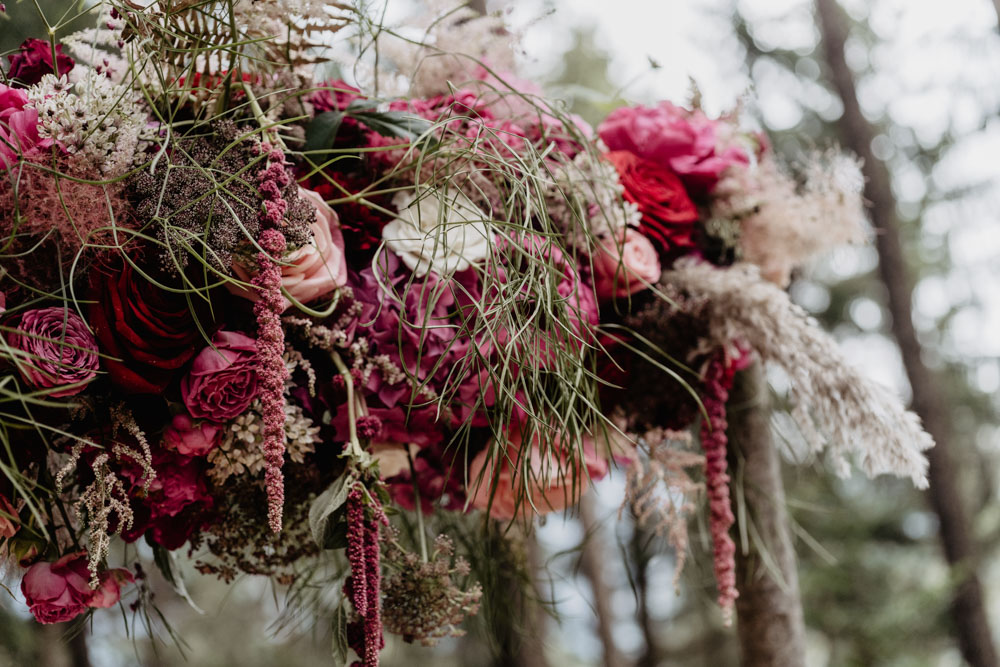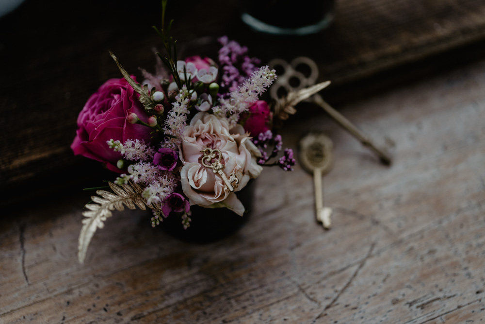 Das Team um Claudias Blumenzauber hat mit einer grandios arrangierten Floristik und Dekoration aus der eher kahlen Umgebung einen traumhaften Märchenwald gezaubert. Die Hauptrolle bei der Farbpalette spielen kräftige Burgundy- und Magentatöne – ein spannender Kontrast zur braun-grünen Natur im Hintergrund. Goldene Akzente bei der Papeterie, Torte und Dekoration sorgen für einen passenden Hauch Prinzessinnen-Glamour. Die romantische Flechtfrisur und das zarte Prinzessinnenkleid der Braut fügten sich perfekt in das märchenhafte Thema des Shootings ein.