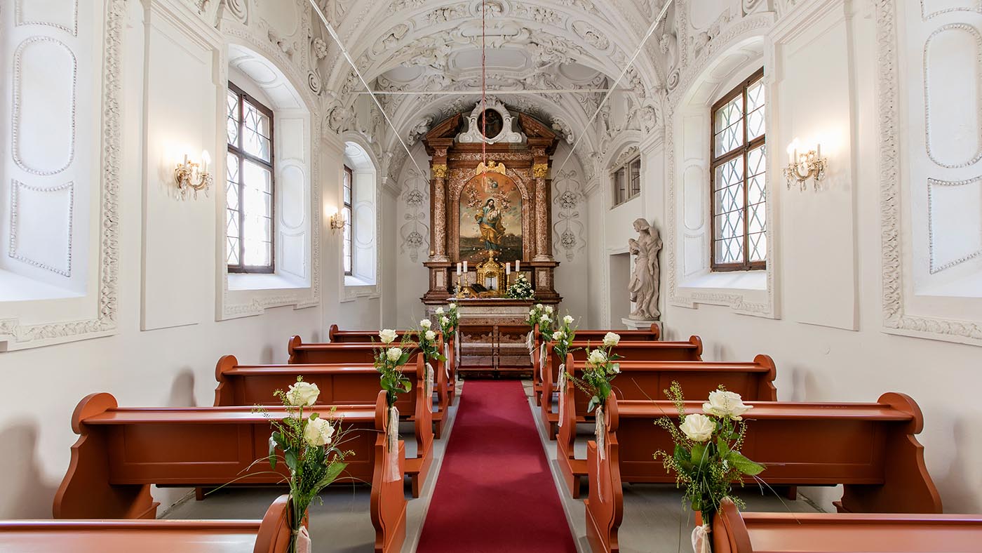 Empfangt eure Gäste im romantischen Garten, bevor es zum Ringtausch in die malerische Barockkapelle aus dem Jahr 1677 geht. Die Kapelle ist katholisch geweiht, aber auch für ökumenische und nicht-christliche Trauungen freigegeben. Auch eine Trauungszeremonie im Freien ist möglich – selbst im Winter, wenn das knisternde Licht der Feuerschalen die Stimmung verzaubert.
